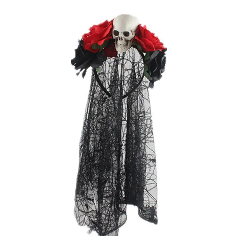 Ободок для волос женский с черной кружевной вуалью, обруч для Хэллоуина с искусственными цветами розы и черепом, мексиканская Корона мертвых, для косплея