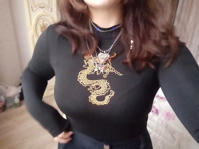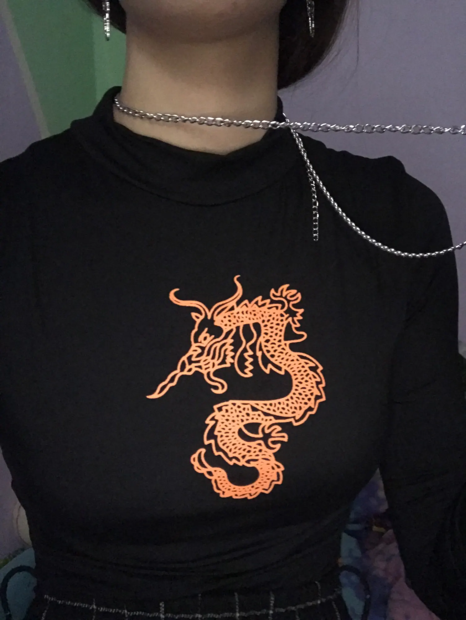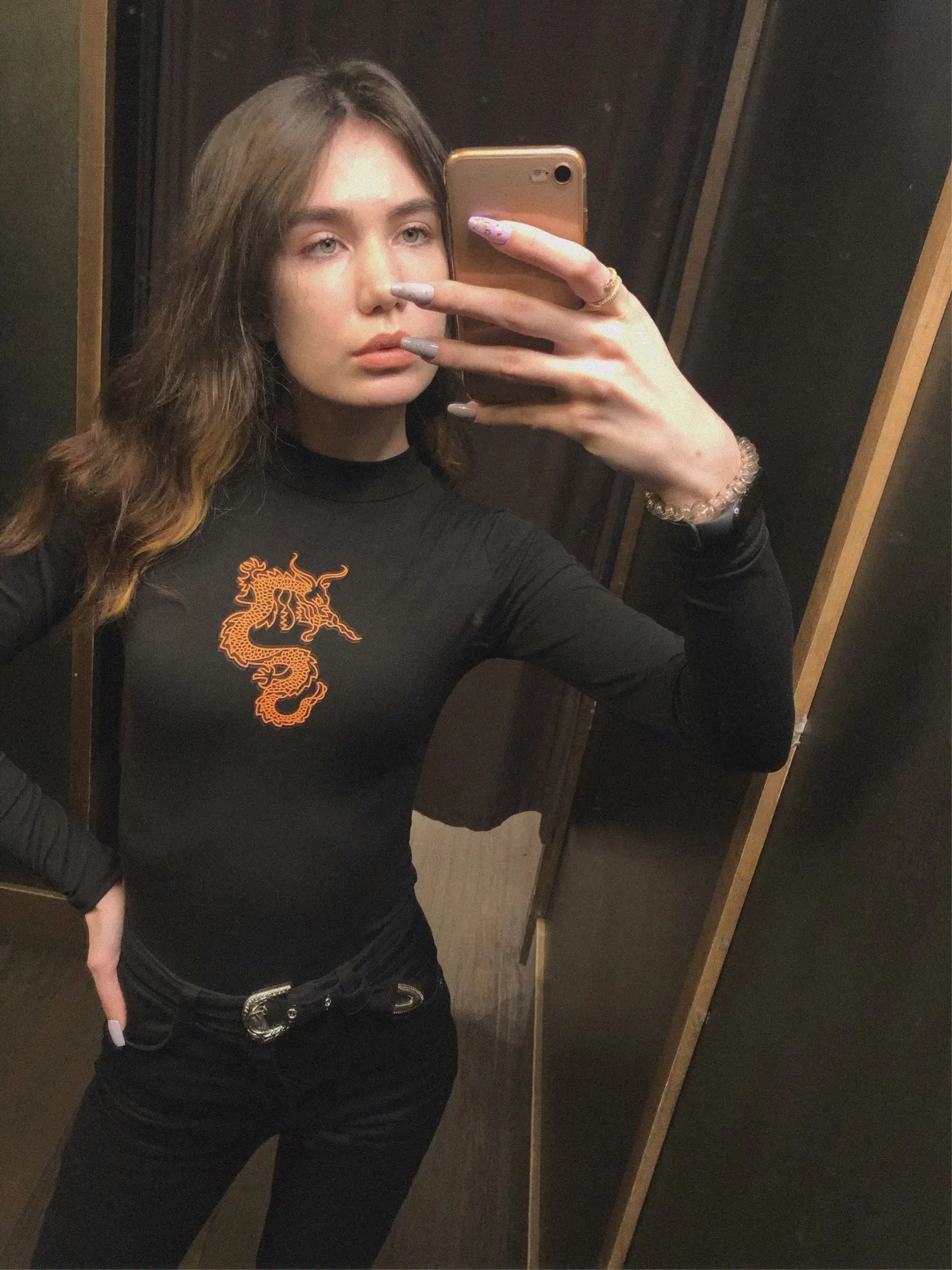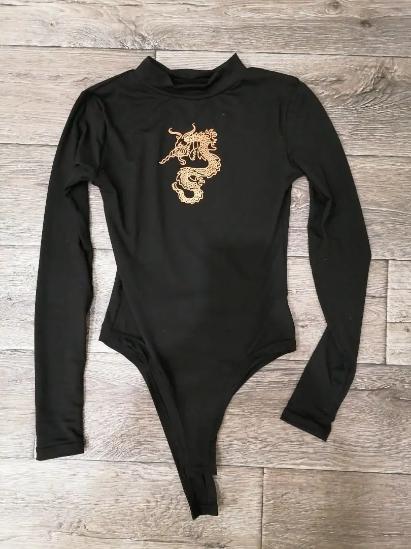 Боди женское с длинным рукавом, с принтом дракона, черное, весна-осень, с круглым вырезом, Y2K