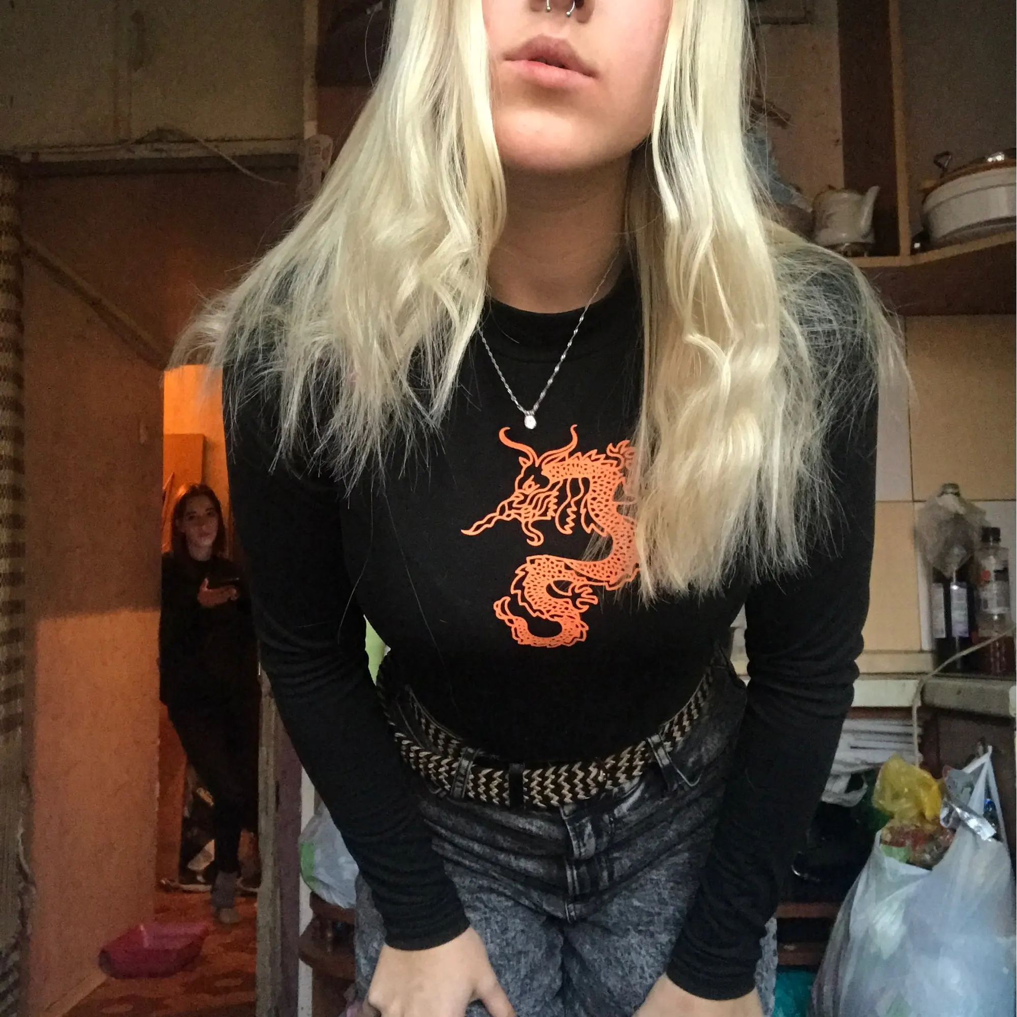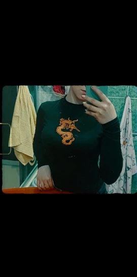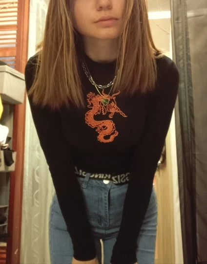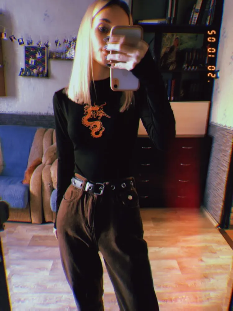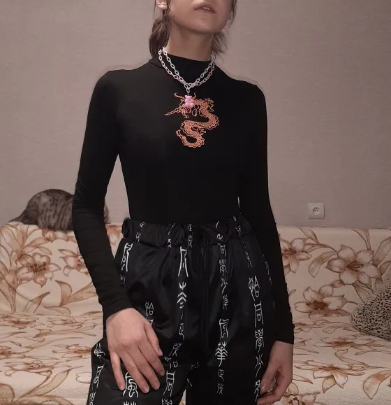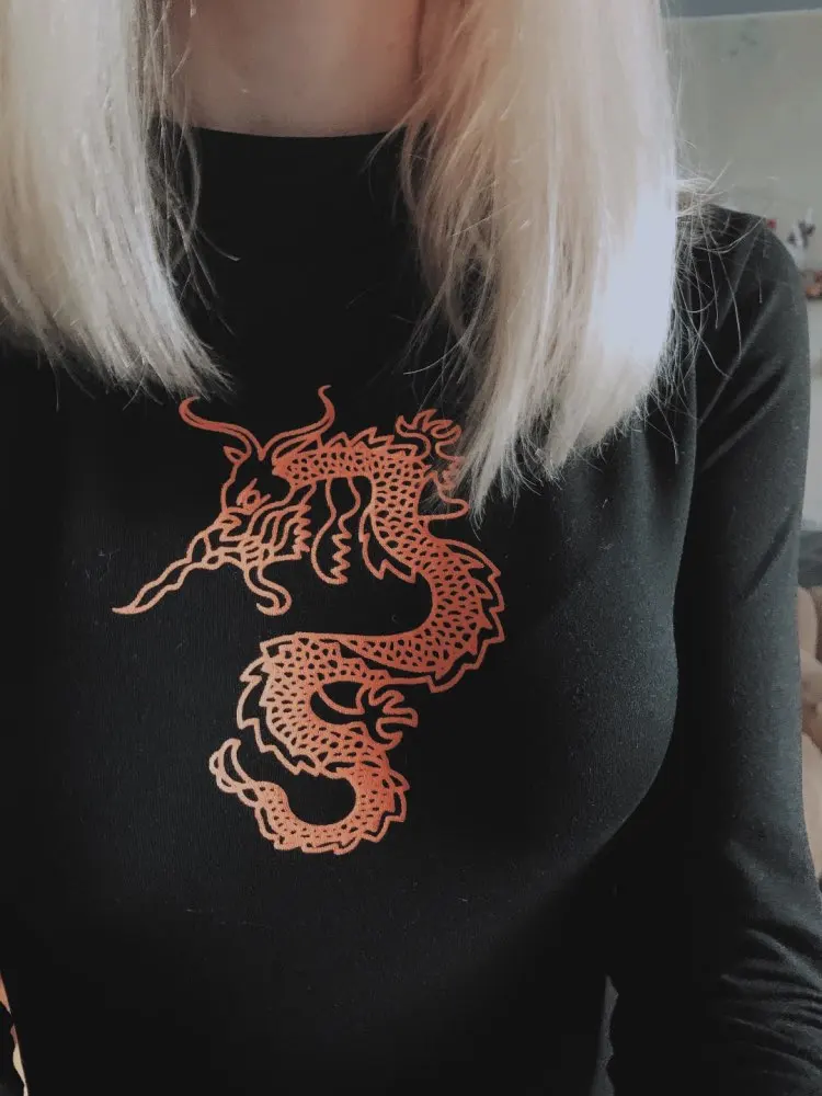 Боди женское с длинным рукавом, с принтом дракона, черное, весна-осень, с круглым вырезом, Y2K