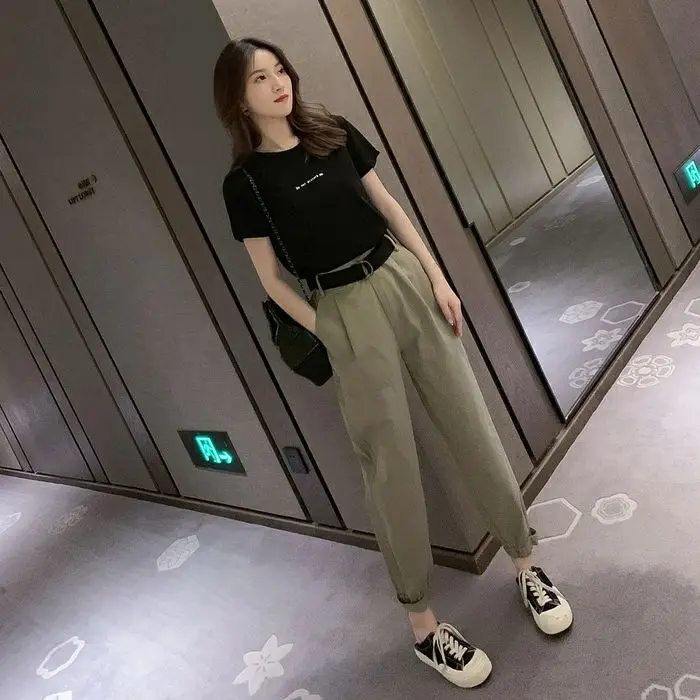 2019 новые весенние зеленые женские штаны карго с высокой талией на...