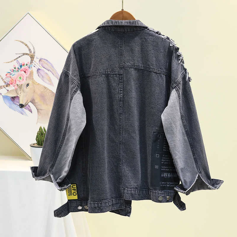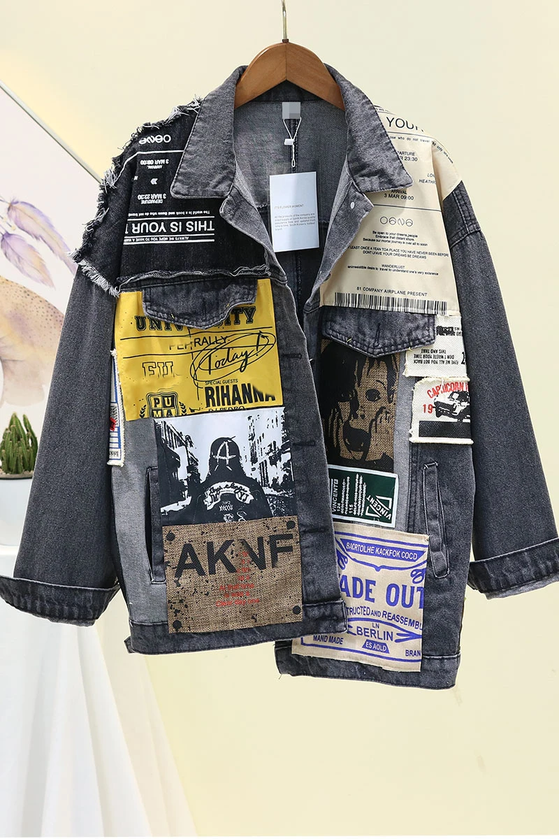 Джинсовая куртка с аппликацией, черная уличная одежда с длинным рук...