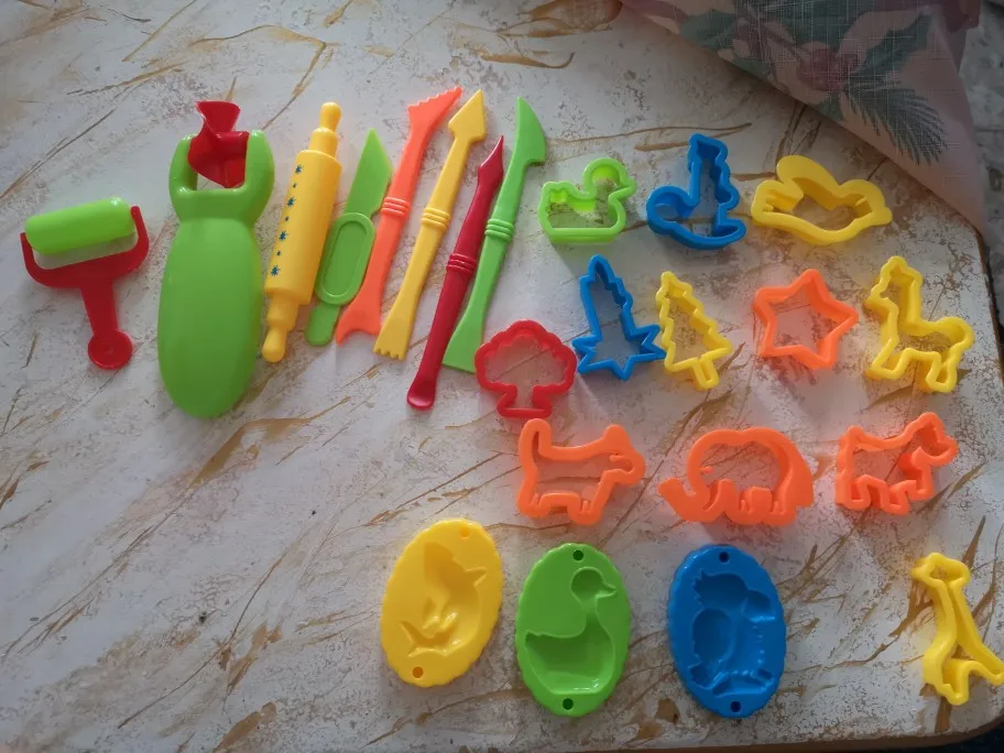 Пластик конечно дешёвый, не знаю сколько скалки прослужат, но ножички разнообразные вполне ничего, ребёнку сразу понравились. Формами врезается хорошо, правда слепить из двух целую фигуру ребёнку точно не под силу, они немного кривоваты..