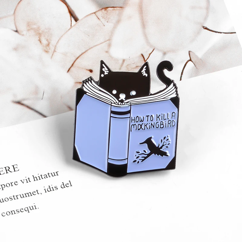 Забавная черная кошка, Просвечивающая синяя книга, брошь, название как убить птицу Mdcking, креативные значки с животными, подарки для детей