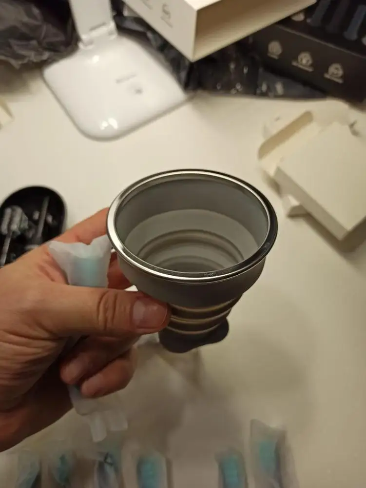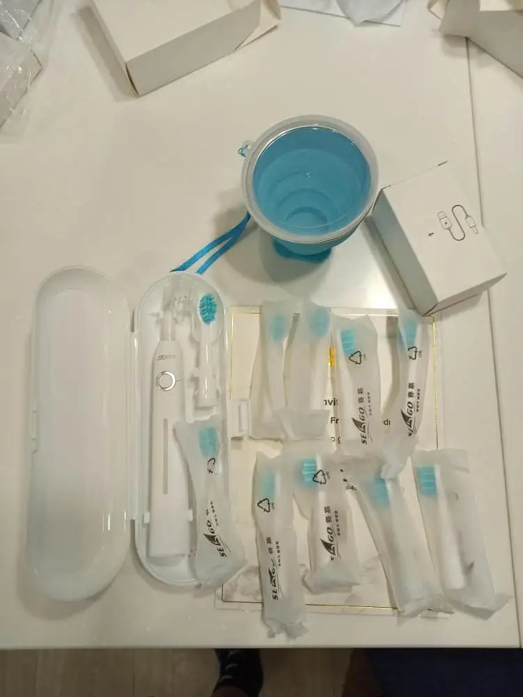 Всё выглядит очень качественно. В упаковке всё как описано - 2 щетки с 5 режимами работы, 10 сменных головок, зарядки от USB, пластиковые дорожные кейсы. Результат после чистки нравится, но т.к. у нас это первые электрические зубные щетки, то сравнивать не с чем. Нет заглушки в дне щетки, где контакт для зарядки (на фото). Но написано про водонепроницаемость щеток, так что может и ничего страшного.
