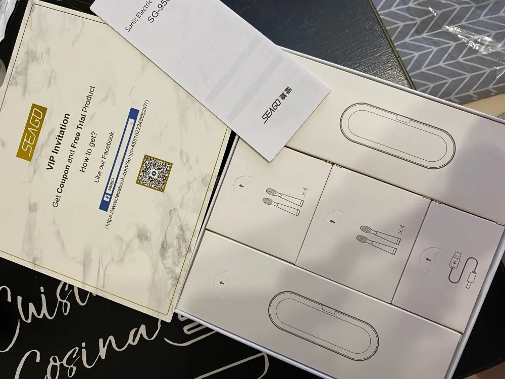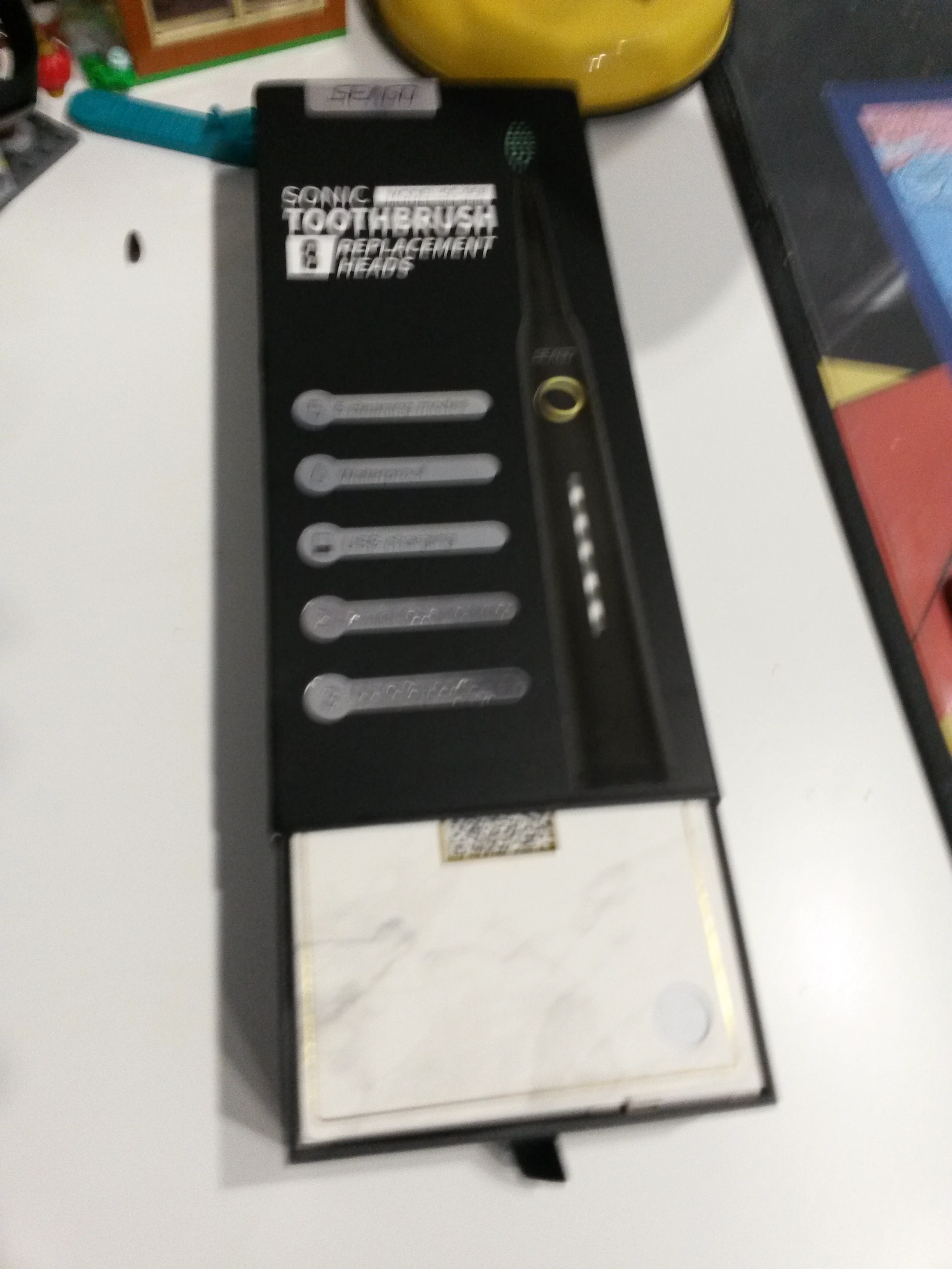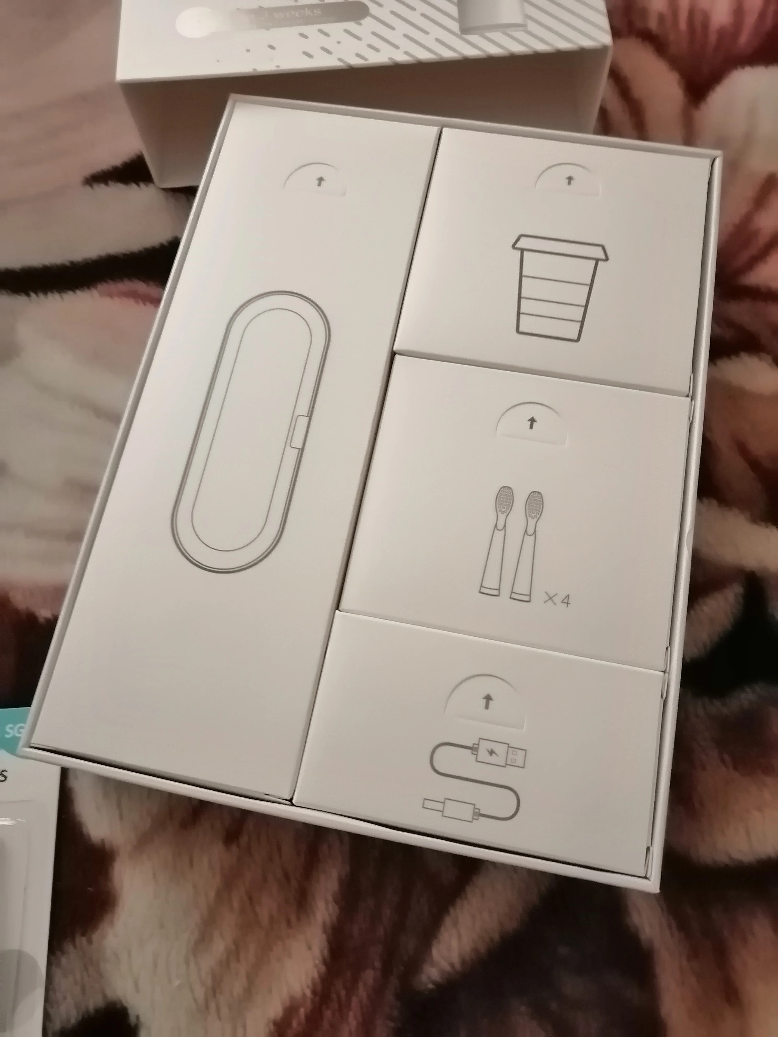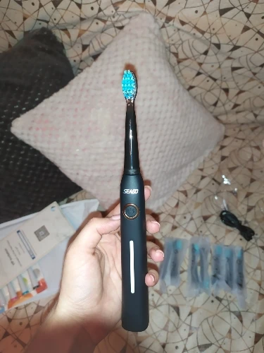 Забирала с отделения Почты России. Ничего не помялось, упаковано в пакеты с пупырчатой пленкой. Коробка со щёткой выглядит презентабельно, внутри все предметы в пакетиках и есть небольшая инструкция на английском. Материал щетки приятный на ощупь, бархатистый, щетинки мягкие. Щётка пришла заряженная. 5 режимов переключаются кнопкой включения, вибрация мощная. Управление интуитивно понятное. Очищает зубы хорошо, но надо приноровиться, после чистки ещё дня два зубы гладкие, даже если чистишь обычной щеткой. В комплекте не помешали бы насадки другой формы.