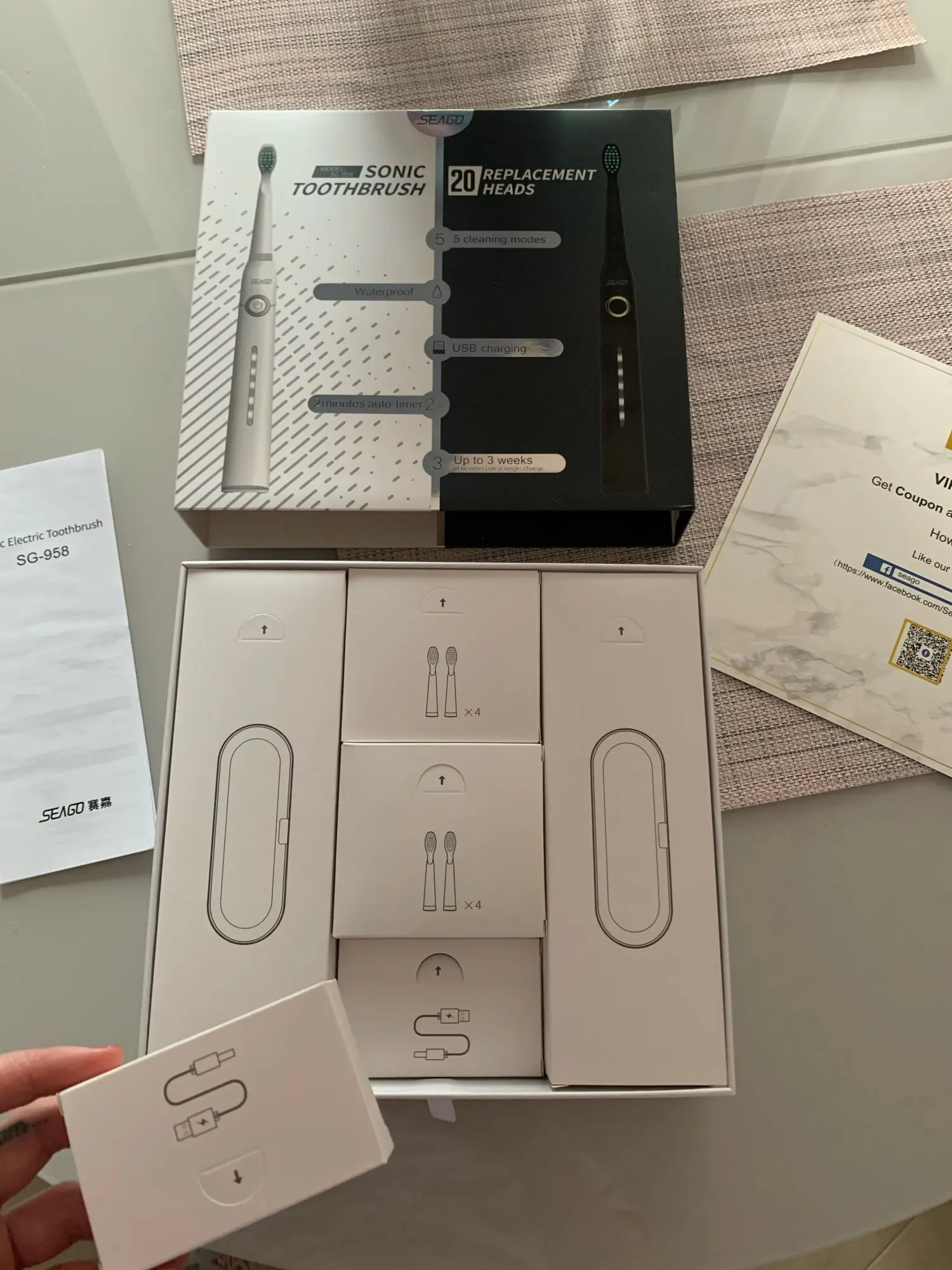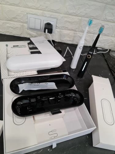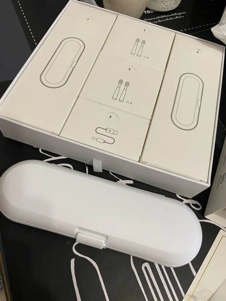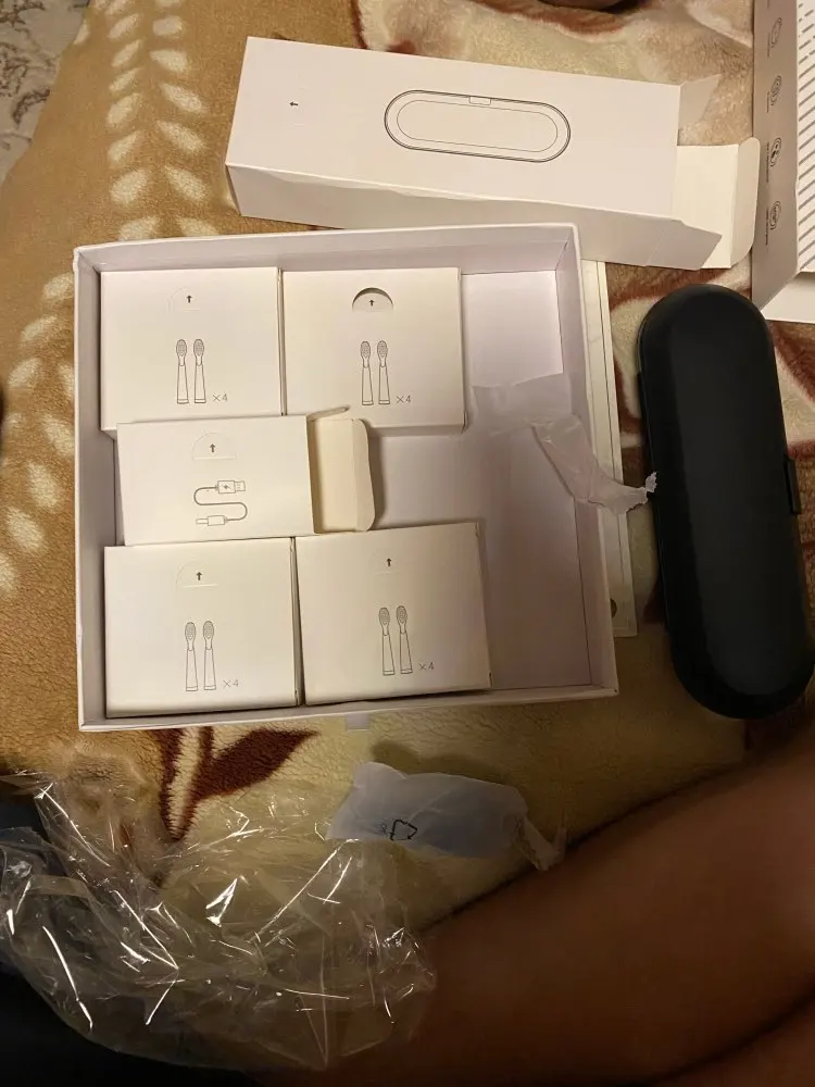 Получил заказ, все пришло быстро, курьер привез домой. Комплектация соответствует тому, что было на сайте. 10 насадок, стаканчик для хранения щетки, кейс для хранения щетки и двух насадок. Попробовали почистить, все вроде хорошо, раньше пользовались обычными щетками. Однозначно рекомендую к покупке.