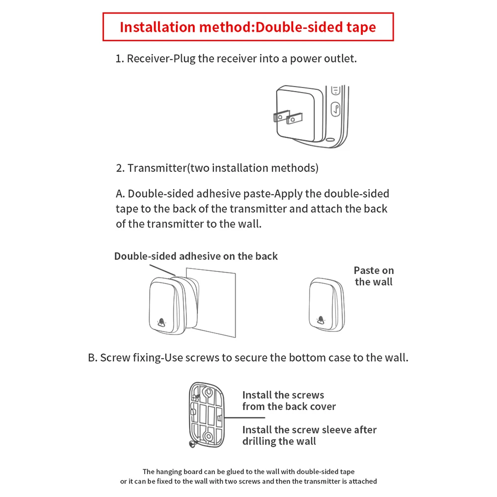 1. Нажмите кнопку, супер обучающий код может свободно научиться сочетать, может быть неограниченным подходящим приемником. 2. Вместо использования батареи, кнопка преобразует кинетическую энергию в электрическую и посылает сигнал при нажатии. 3. Передатчик может нормально работать в снежной или высокой температуре окружающей среды, водонепроницаемый и пыленепроницаемый. 4. Если несколько кнопок соединены с одним или несколькими приемниками в одной системе, каждая кнопка может быть установлена на другой мелодии звонка. 5. Функция отключения памяти: Включите питание снова после выключения питания, не нужно повторно регулировать и блокировать мелодию звонка. 6. Приемник доступен в различных вилках, штепсельных вилках США/ЕС/Великобритании и адаптерах Австралии, подходит для большинства стран. 7. Привлекательная подсветка мигает, когда кто-то толкает дверной звонок. Особенно подходит для пожилых, глухих и беременных женщин. 8. Напряжение приемника составляет 220 В. 9. Приёмник находится на расстоянии 150 метров (в открытой местности), что может зависеть от окружающей среды и препятствий. 10. Приемник имеет 60 мелодий звонка на выбор, а громкость 0-110 дБ на 5 уровнях. 11. Просто подключите приемник к электрической розетке, кнопочный передатчик может быть приклеен к двери с помощью клейких лент. 12. Размер передатчика: 70*46*24 мм, Размер приемника: 92*62*32 мм Примечание: Кнопка не может быть размещена на железной двери, потому что это будет мешать сигналу. Если приемник не звонит при нажатии кнопки после получения дверного звонка, Пожалуйста, подключите дверной звонок.
