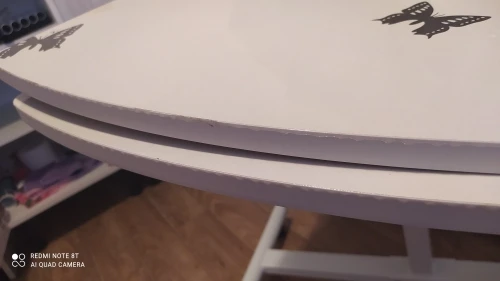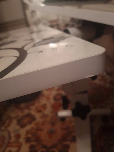 Столик долго отправлялся, в пути был 20 дней. Чтобы не оплачивать доставку, забирала из пункта выдачи в ОЗОНе. Наличие "рыжиков" и покоцанных гаек навевает мысль, что он уже у кого-то побывал. Специально для тех, кто интересуется как выглядит столешница без накладок, сделала фото (3). Столик свою функцию выполняет.