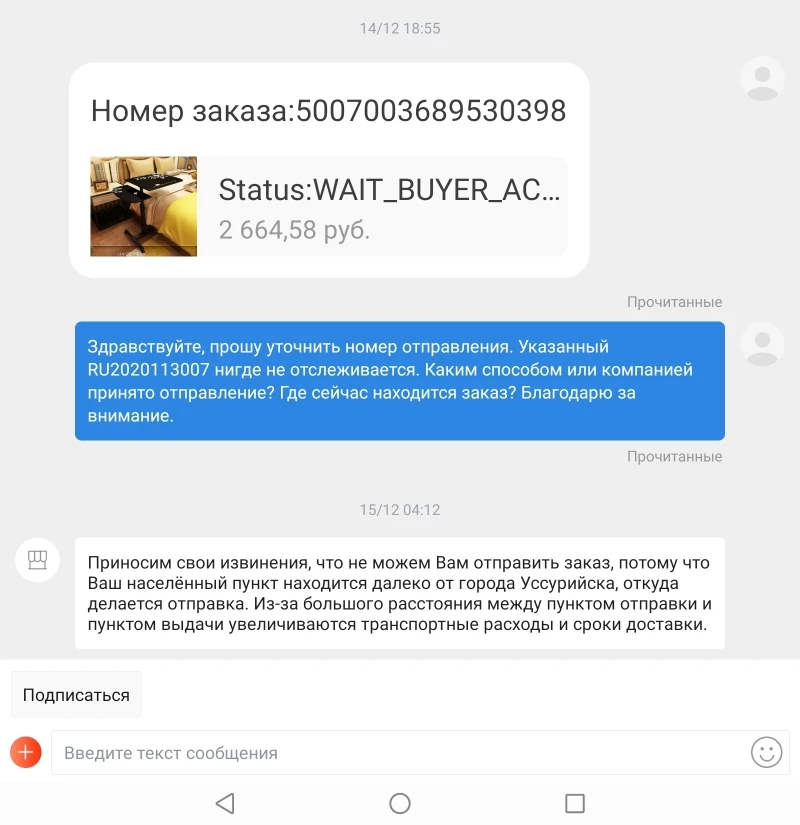 Мне товар не был отправлен вообще. Сначала продавец потребовал денег дополнительно на сбер. Карту. Я обратился в тех поддержку али экспресс. После этого появился трек отправки. Но по этому номеру никакого движения не было. Я попросил продавца уточнить трек, на что он ответил что ничего отправлять не собирается. Скрин прилагаю. Странно что сам АЭ допускает какие-то дополнительные оплаты прямиком на карты в обход площадки.