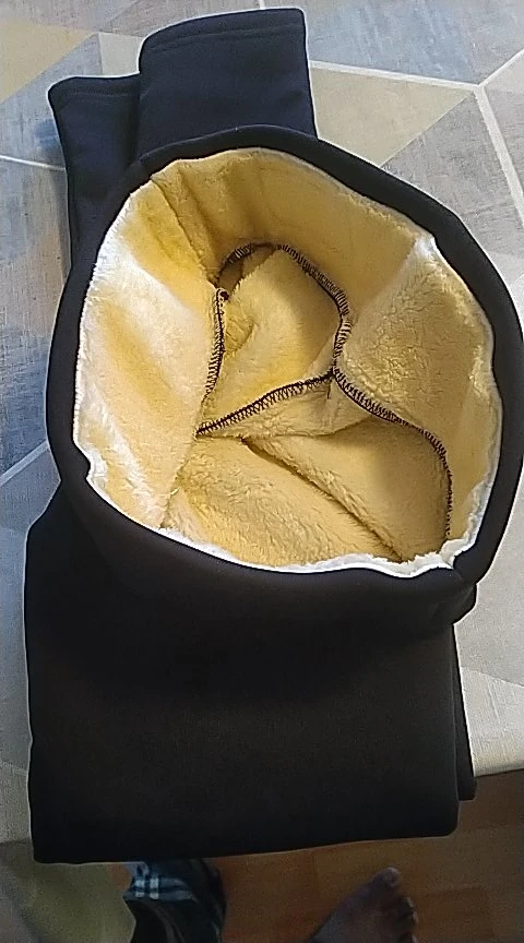 Супер штаны, очень тёплые, думаю, их вполне можно будет носить даже в сильные морозы без колгот. Благодаря высокой талии даже стройнят, хотя я боялась, что буду в них как бочка (всё-таки они сами по себе такие трлстенькие). Но нет, сели отлично, небольшой животик спрятали)) Мой рос размер 44, заказывала М.