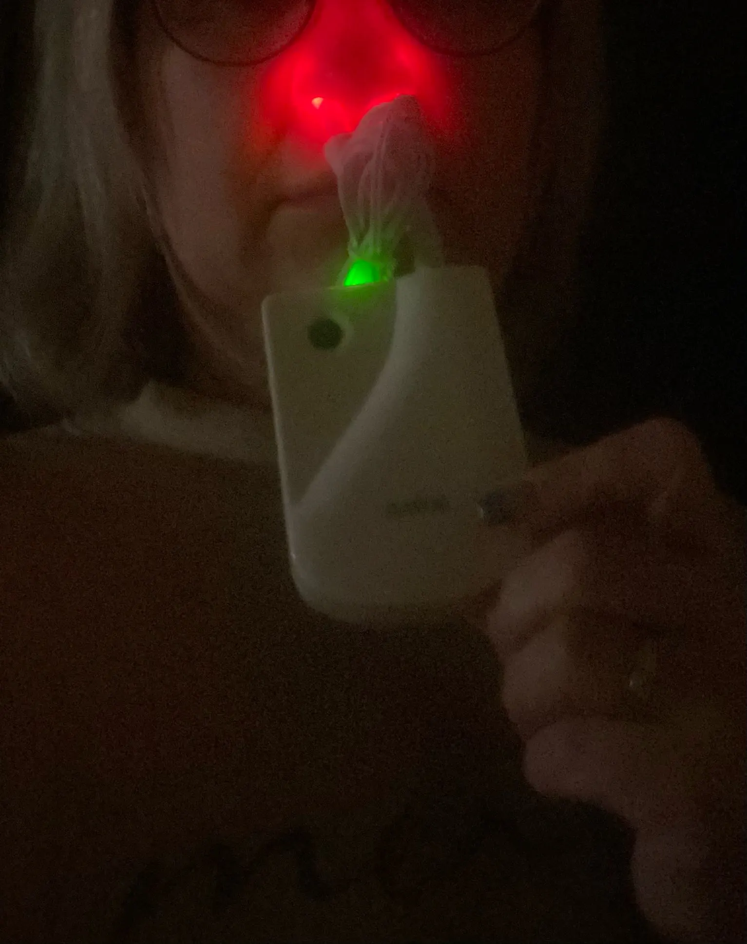 4. Снимите крышку маленького штифта перед использованием. Положите резиновый зажим для носа клипса в нос, убедитесь, что 2 светильник точки в нос около 1 см до 1,5 см глубина;