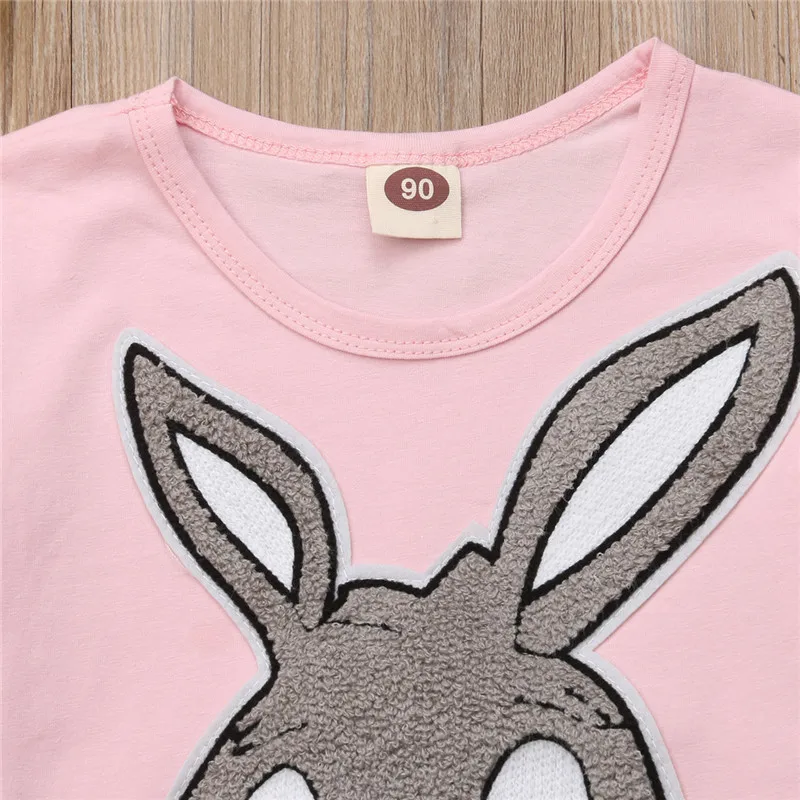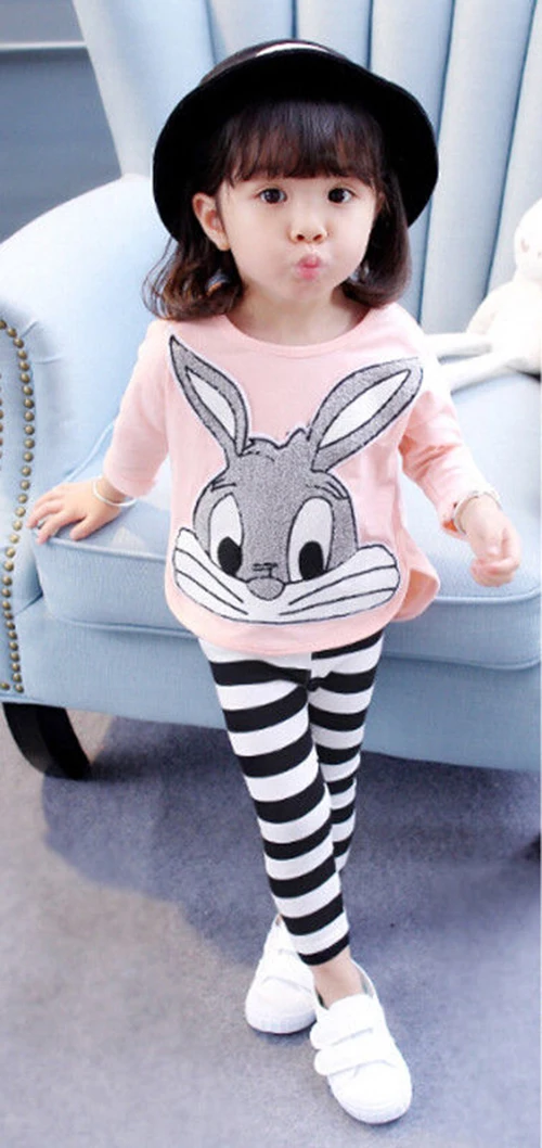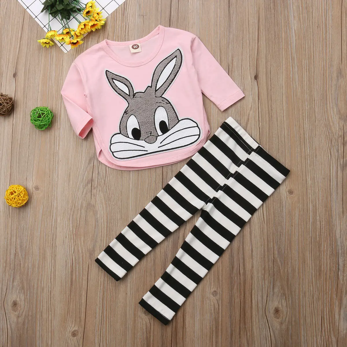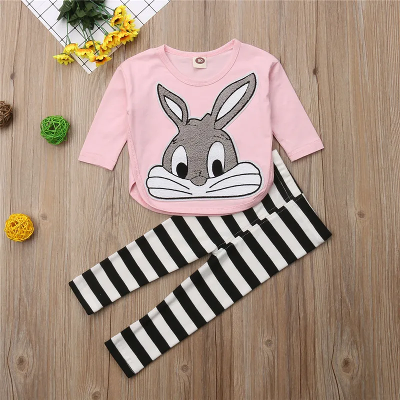 Одежда для маленьких девочек милая розовая футболка с принтом кролика Топы + штаны в полоску весенне-осенняя одежда для девочек