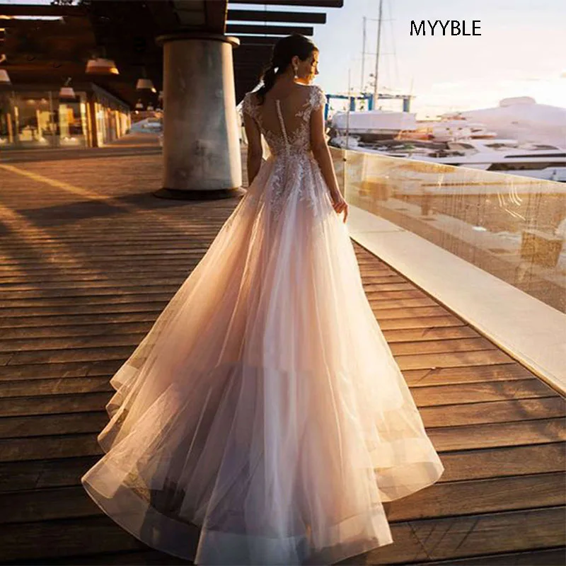Пляжное свадебное платье MYYBLE в стиле бохо с круглым вырезом, кружевной топ с аппликацией, винтажное свадебное платье принцессы, простое платье невесты с рукавом-крылышком 2020