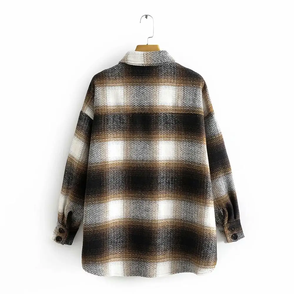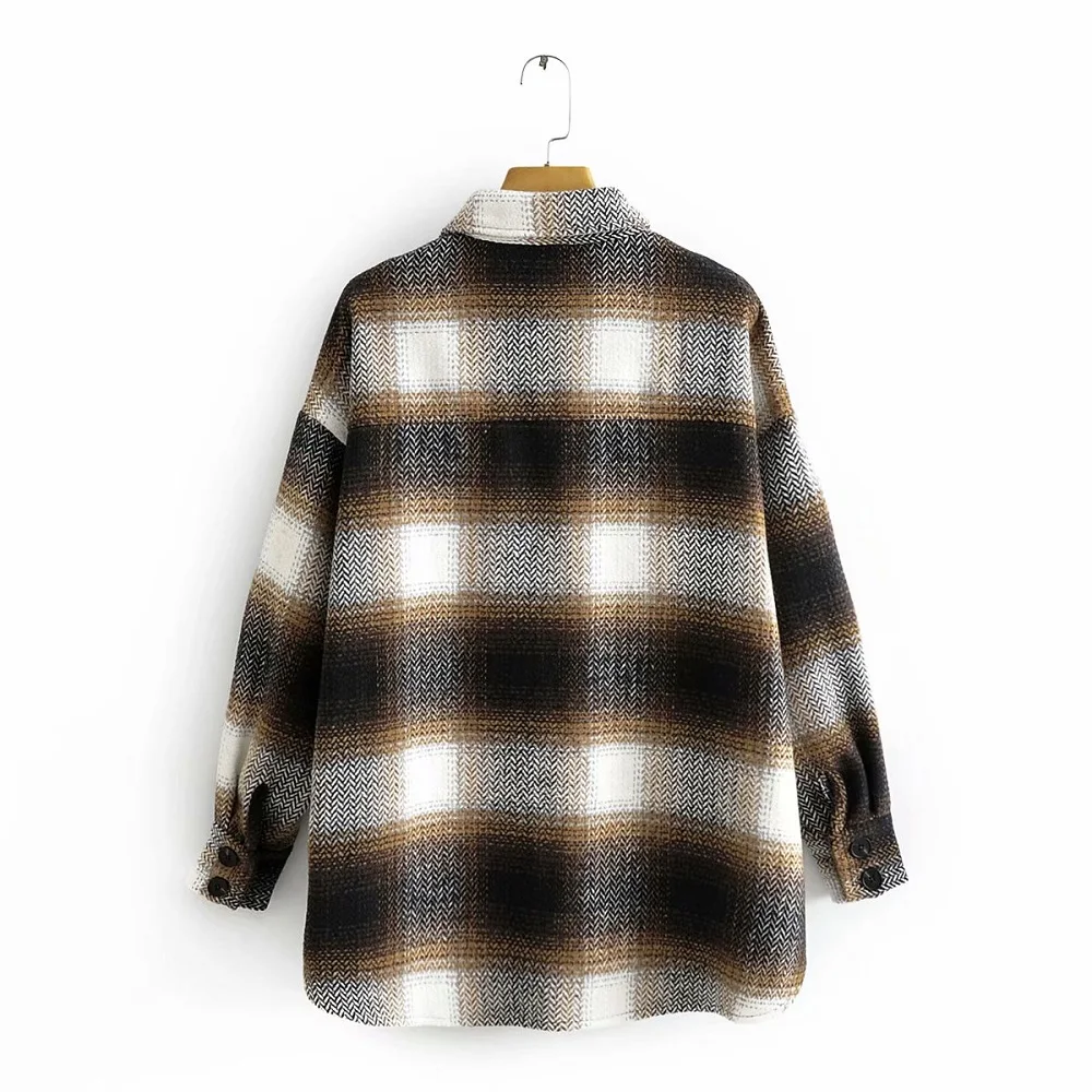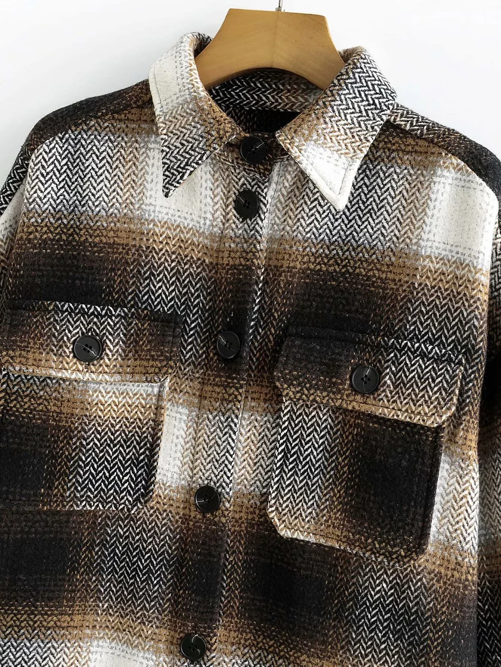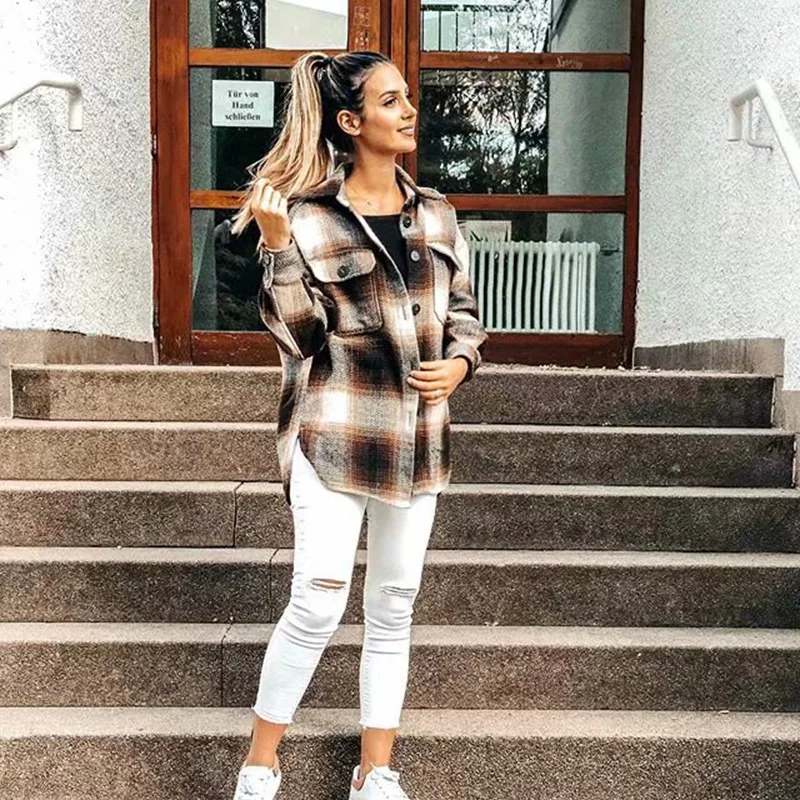Женская клетчатая куртка, винтажная куртка контрастных цветов с карманами и отложным воротником, Повседневная Уличная одежда для девочек