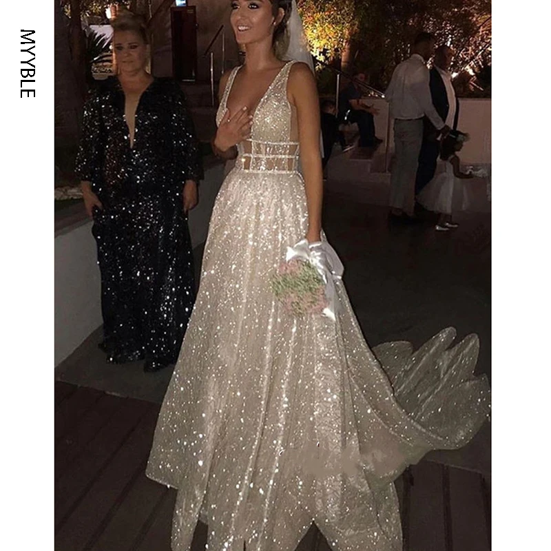 Блестящие Свадебные платья для невесты, с V-образным вырезом, открытой спиной, бисером, жемчугом, трапециевидной формы, со шлейфом, скромные свадебные платья, 2021