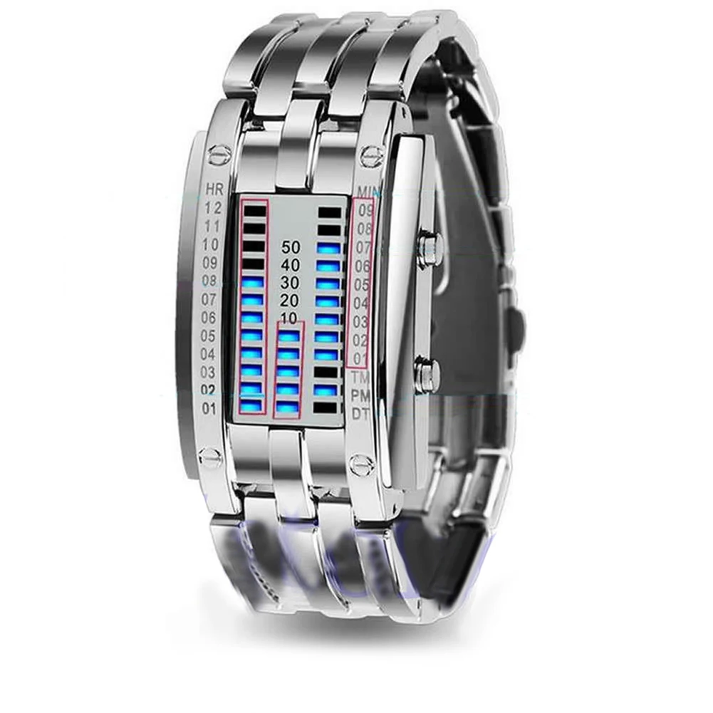 Модные двоичные часы Future Technology для пар, Креативные мужские и женские часы из нержавеющей стали, светодиодные наручные часы-браслет с датой, спортивные часы