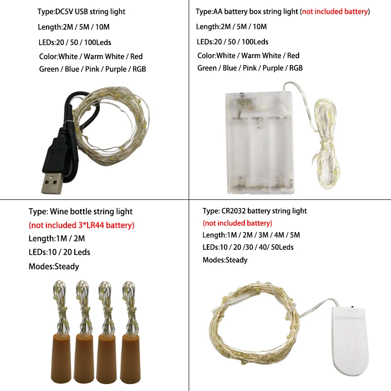Светодиодный струнный светильник 1 м 2 м 3 м 5 м 10 м, гирлянда, светильник s, домашний Рождественский Свадебный декор, питание от батареи АА/USB, сказочный светильник sОсобенности:Супер яркий и низкое энергопотребление.Полупроводниковый чип-светильник, устойчивый к поломке и устойчивый к тряске.Длительный срок службы: более 100000 часов.Безопасный и экологически чистый, без излучения или элементов загрязнения.Подходит для рождества, свадьбы, Дня Святого Валентина, вечерние, пабы, концерта, модного шоу и т. д.ПараметрыОснование шнура: батарея USB/AA/батарея CR2032/батарея L44(Аккумулятор в комплект не входит)Количество СВЕТОДИОДНЫЙ: 10 шт./20 шт./30 шт./50 шт./100 шт.Длина: 1 м/2 м/3 м/5 м/10 мПитающее напряжение: DC 5V/4,5 V / 3VРабочая мощность: 5 Вт-8 Вт/комплектМатериал свинца: серебристый/медный проводВодонепроницаемость: IP65Цвет СВЕТОДИОДА: белый/теплый белый/красный/зеленый/синий/фиолетовый/многоцветныйПосылка включает в себя:1X светодиодный светильник