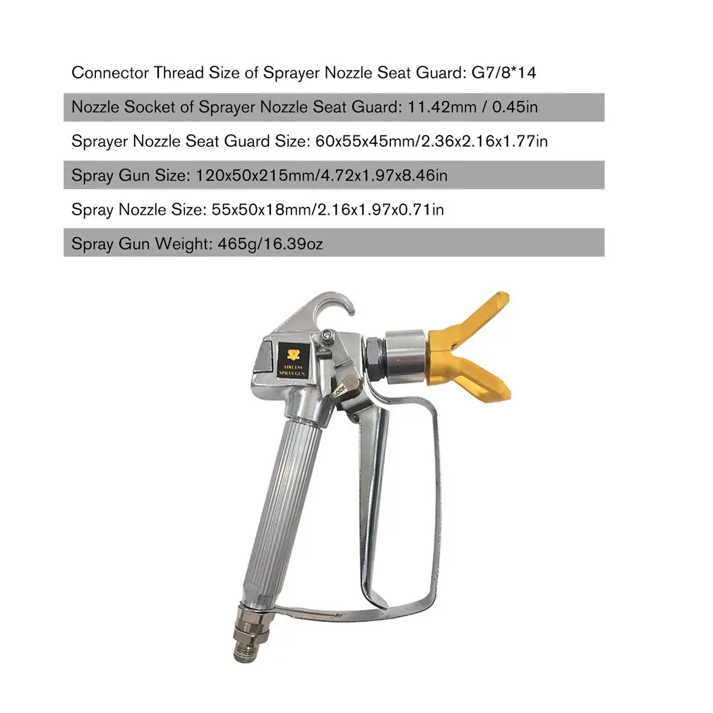 Краскораспылитель Материал: алюминийМатериал сопла распылителя защита сиденья: алюминий + железо + пластикРемесло: Алюминий окисленияЦвет: красный, желтый (опционально)Триггер: 4 пальцевМаксимальное рабочее давление: 3600psiСовместимость: для титана, Вагнера распылительной машиныПрименение пигмента краски:Высокое содержание эпоксидной краски и грунтовки.Высокое содержание полиуретана верхнее покрытие и грунтовочные покрытия.Архитектурные латексная краска.Грунтовка эпоксидной смолы угля.Резервуары и Трубопроводное внутреннее покрытие.Размер резьбы соединителя сопла распылителя защита сиденья: G7/8*14Насадка для сопло сопла распылителя защита сиденья: 11,42 мм/0,45 дюймаРаспылитель сопла безопасности Размер: 60x55x45 мм/2.36x2.16x1.77inРазмер распылителя: 120x50x215 мм/4.72x1.97x8.46inРазмер распылителя: 55x50x18 мм/2.16x1.97x0.71inПистолет-распылитель Вес: 465 г/16,39 унций