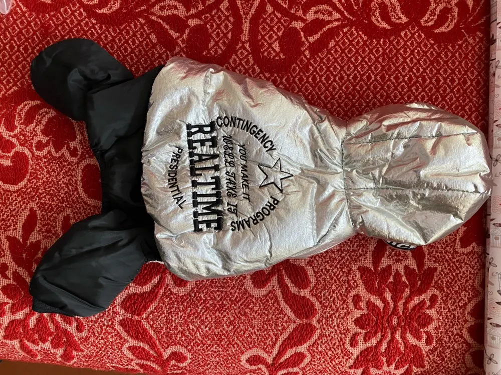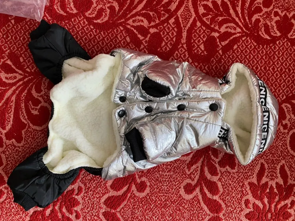 Костюм хорошего качества, нитки не торчат, запах практически отсутствует. Доставка до Хабаровска составила 14 дней. В общем, покупкой довольны, но немного не угадали с размером. Начиталась отзывов и согласно им заказала размер L, задние лапы утонули, думаю М было бы самое то. Вес нашей собаки 3кг. Я вручную подшила серебристую часть комбинезона к чёрной (к самому её концу) и теперь всё ОК.