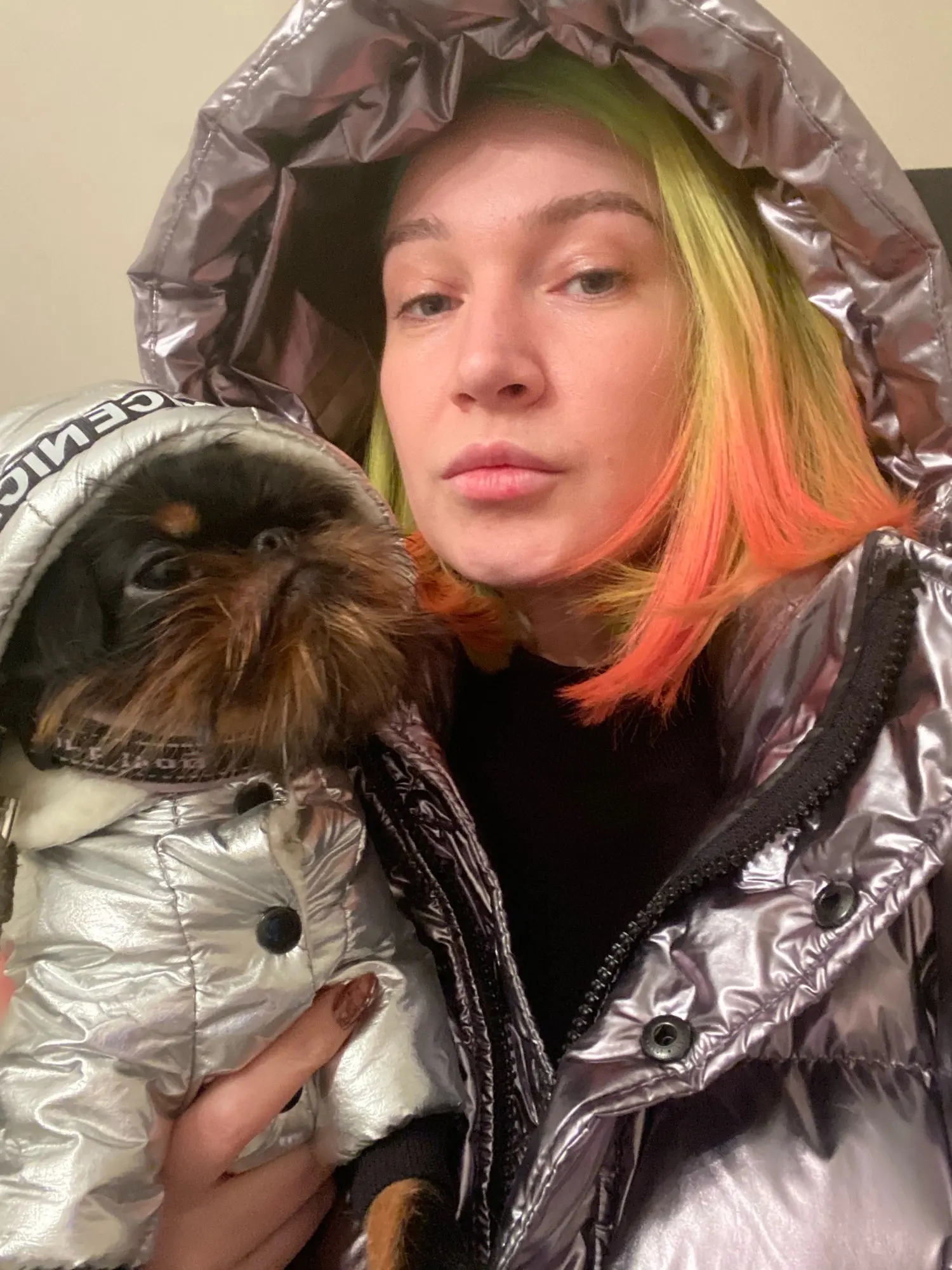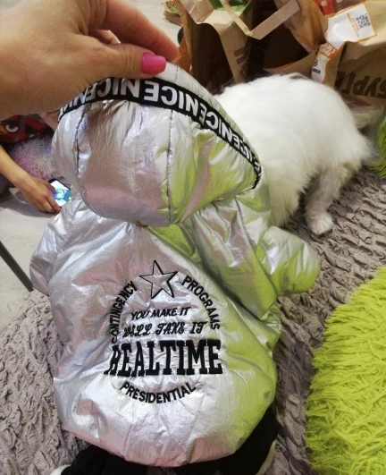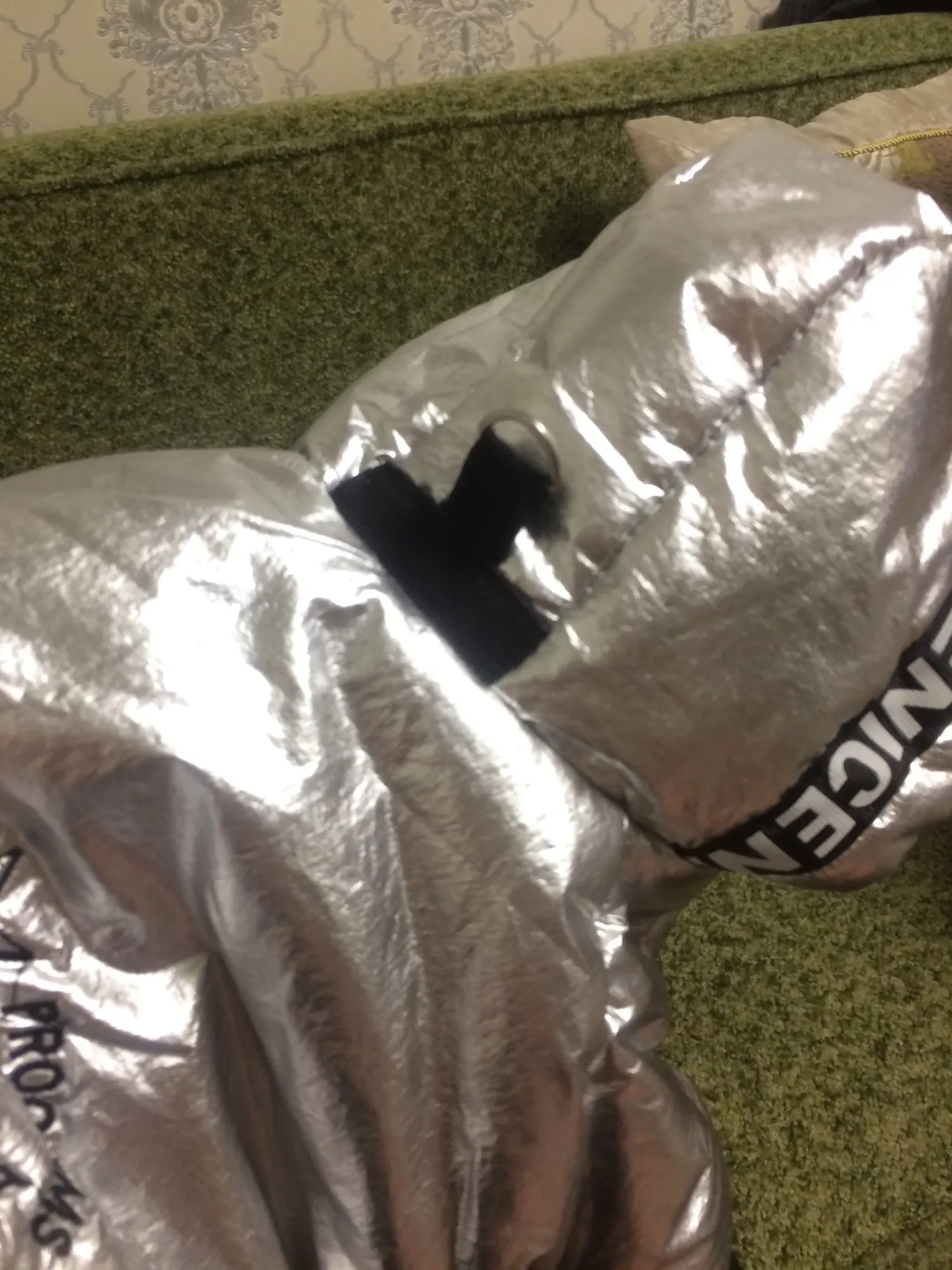 отличный пуховик, все хорошо, но щенок пока не понимает что происходит
