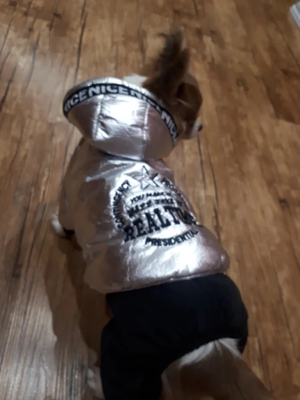 Классный костюмчик, очень жаль, что нет петельки для поводка и клепки для копюшона, пришила самостоятельно, потому что при хождении копюшон сваливатеся на глаза собачке. Качество отличное, доставка 2 недели. На мальтезе 2,6 кг взяла размер XL, немного великоват, но можно подогнуть, зато не стесняет движения при ходьбе. Спасибо продавцу