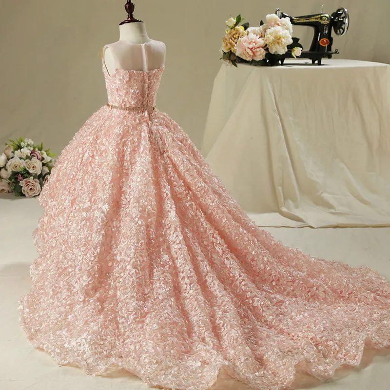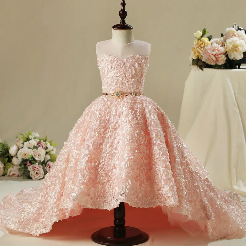 Платье для девочек с цветами, свадебное Розовое Кружевное длинное платье принцессы со шлейфом для девочек, детская одежда для дня рождения, изготовление на заказ