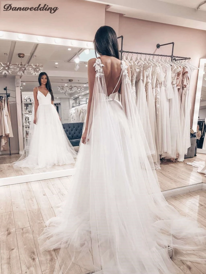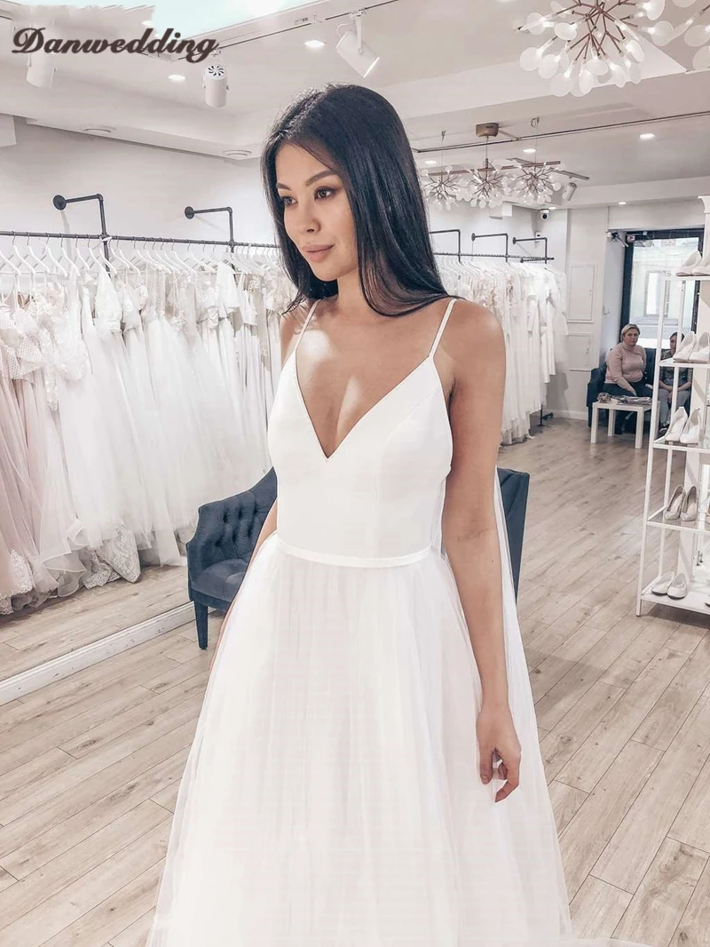 Платье Свадебное ТРАПЕЦИЕВИДНОЕ на бретелях-спагетти, простой тюлевый кружевной сарафан с аппликацией и шлейфом, с V-образным вырезом, без рукавов, на шнуровке