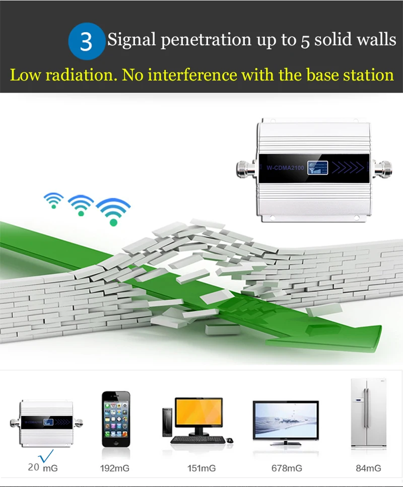 Идеально подходит для 1 - 2 комнат или небольших офисов:Попрощайтесь с удаленными звонками в вашем доме.1. Работает для WCDMA. Повторитель сигнала 2100 МГц.2. Диапазон частот: Uplink:1920 ~ 1980 МГц нисходящий канал: 2110 ~ 2170 МГц3. С ЖК-дисплеем, может указывать состояние сигнала.4. Площадь покрытия: около 300 кв. М без покрытия 1. Крышка антенны около 100-150кв. М.5. Высокая линейная конструкция, ALC технология.6,1 набор с 2G 3G 4G Наружной антенной, 2G 3G 4G внутренней антенной, Репитер сигнала. Идеально подходит для домашнего использования.7. Улучшите внутренний мобильный сигнал, больше не снижайте звонки, больше нет плохой скорости сети.