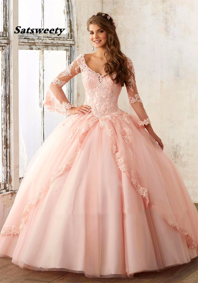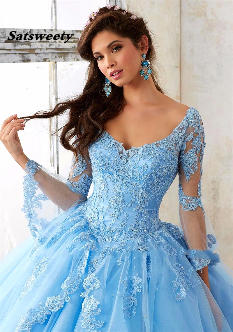 2022 небесно-голубое элегантное бальное платье с длинным рукавом, платья для девушек с кружевной аппликацией, платья для 15-16 лет