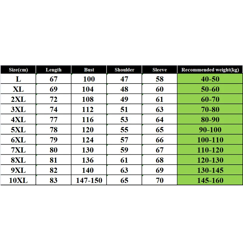 Длина 9XL: 82, обхват груди: 140, ширина плеч: 63, длина рукава: 69, рекомендуемый вес (кг):130-145
