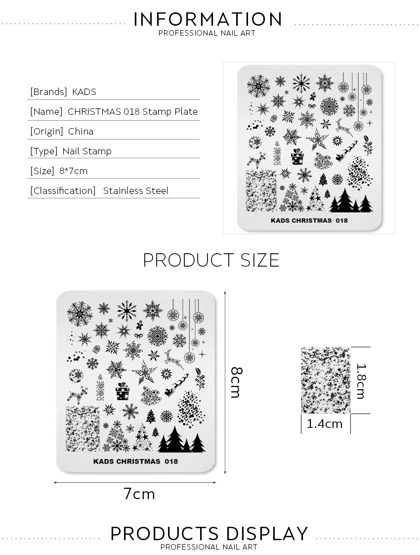 KADS пластина для стемпинга для нейл-арта, Рождественская модель 018 со снежинками, сидаром, лося, трафарет для штамповки ногтей, принтер для маникюра