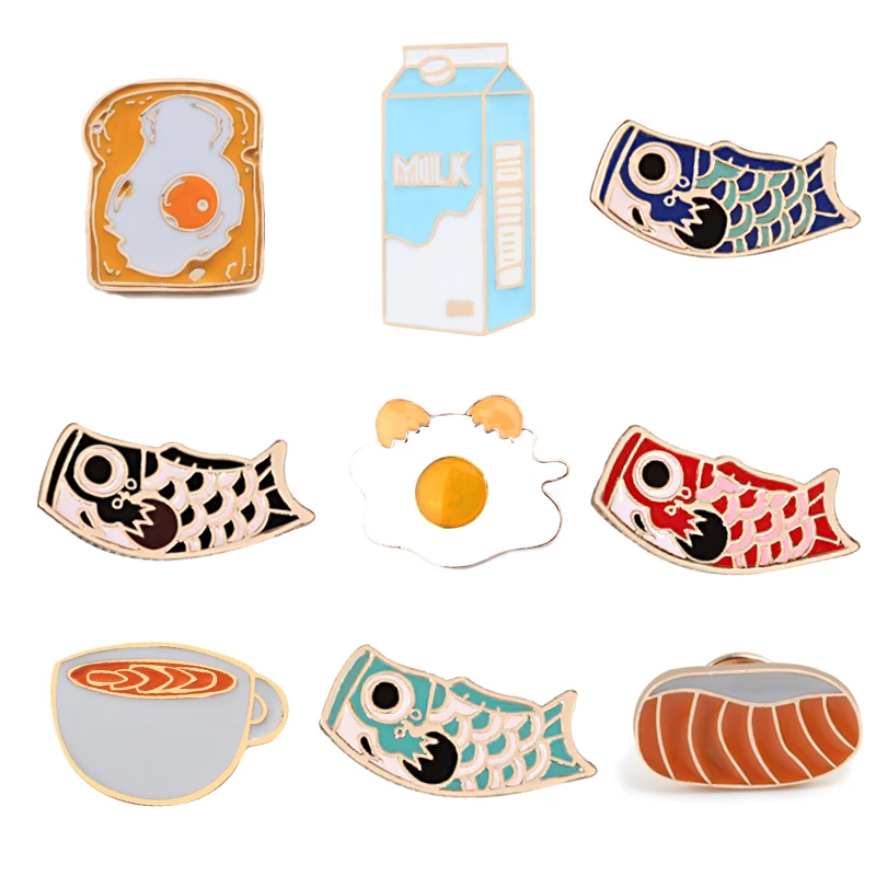 Эмалированная брошь на лацкан в форме рыбы кои, молока, Японская еда, сумка, украшение для одежды, хлеб, яйцо, чай, значок на булавке, Брошь унисекс подарок