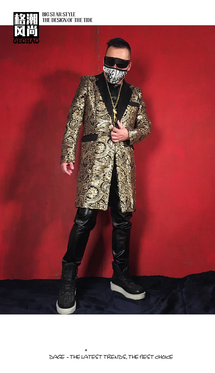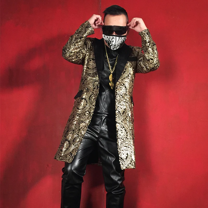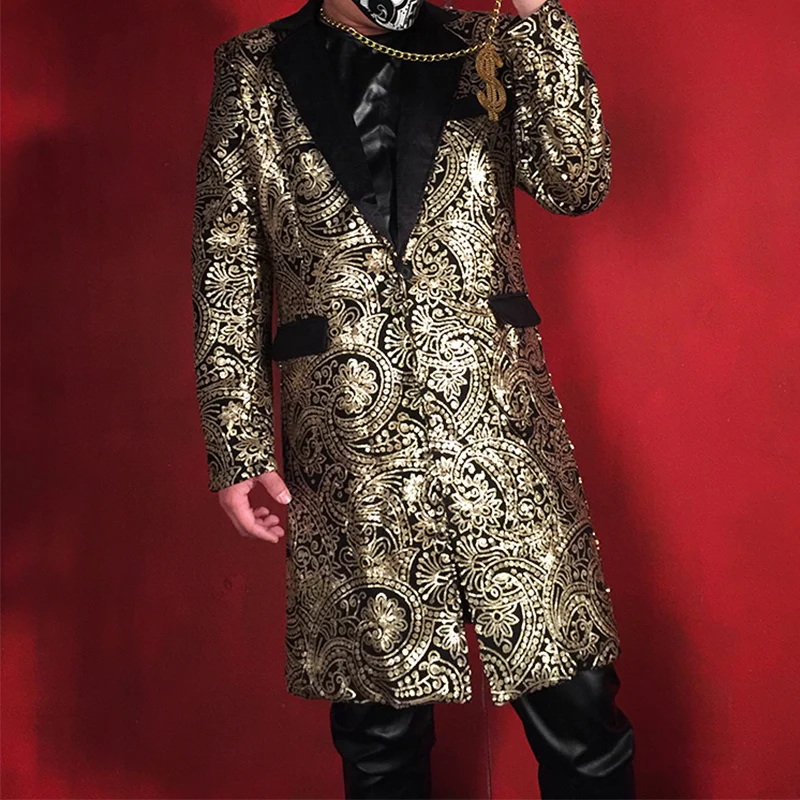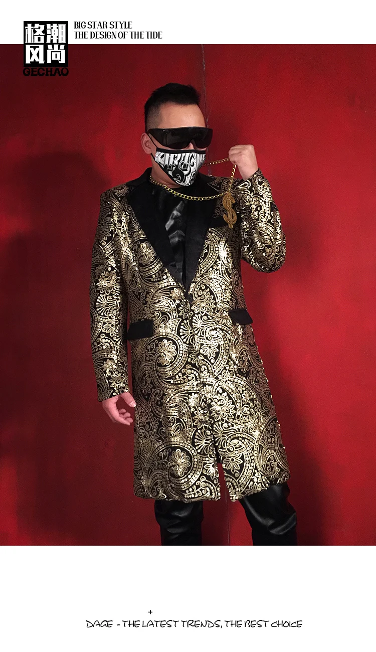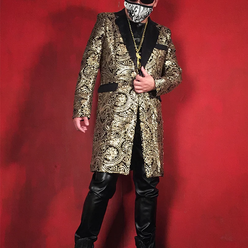 Модный Длинный блейзер, пальто, костюмы для сцены, индивидуальный пошив, мужской костюм, размер, золотые блестки, приталенный, повседневный мужской пиджак