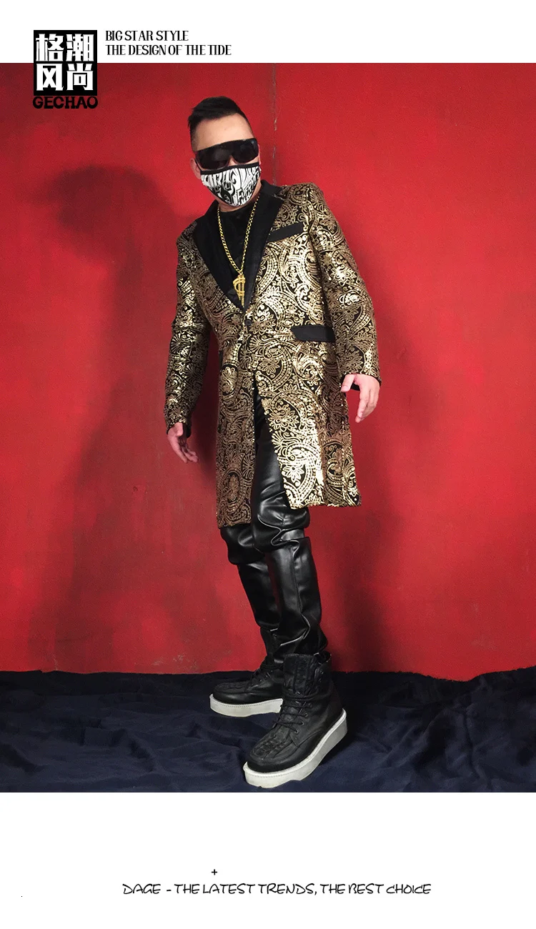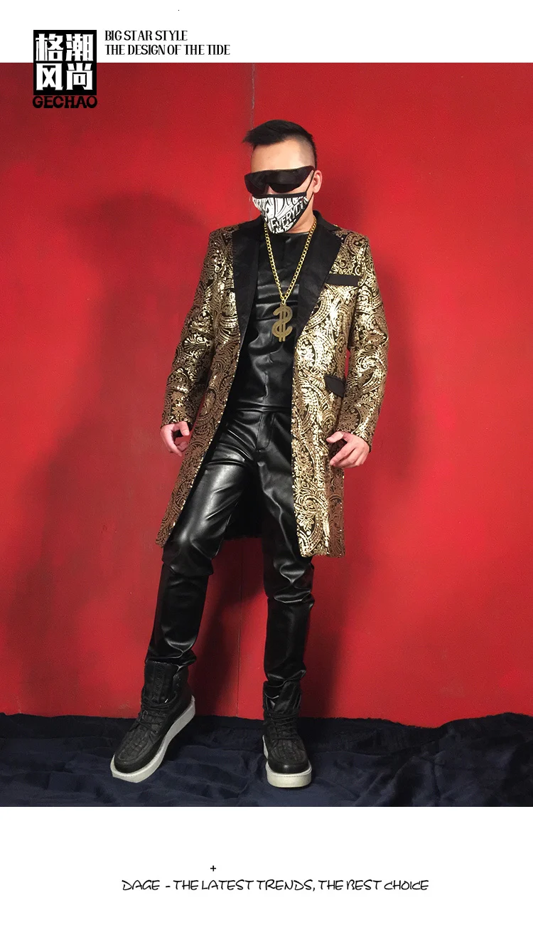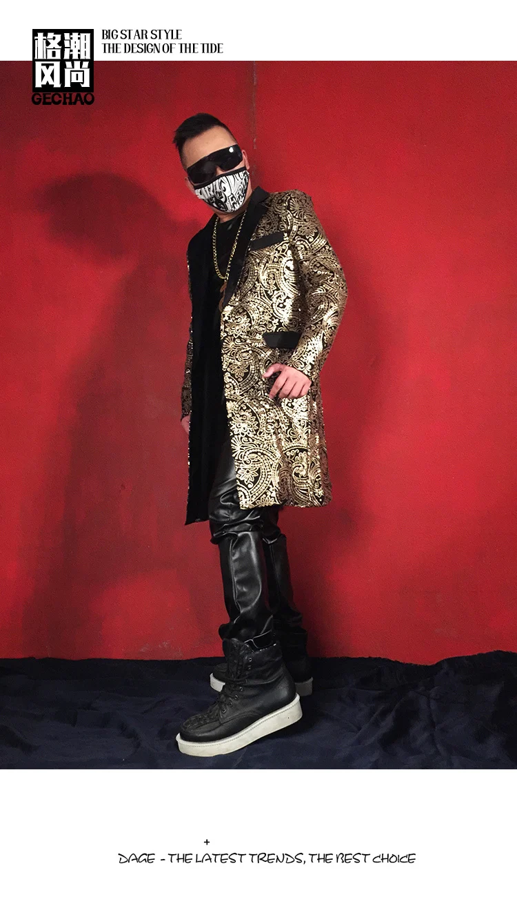 Модный Длинный блейзер, пальто, костюмы для сцены, индивидуальный пошив, мужской костюм, размер, золотые блестки, приталенный, повседневный мужской пиджак
