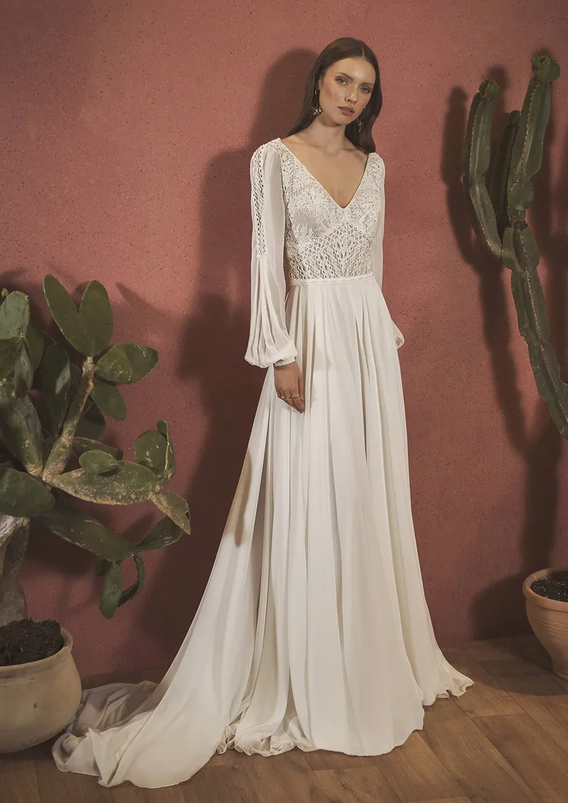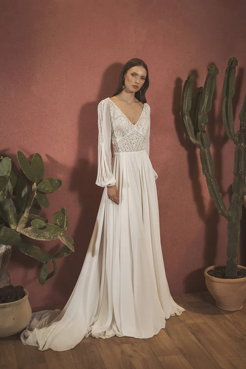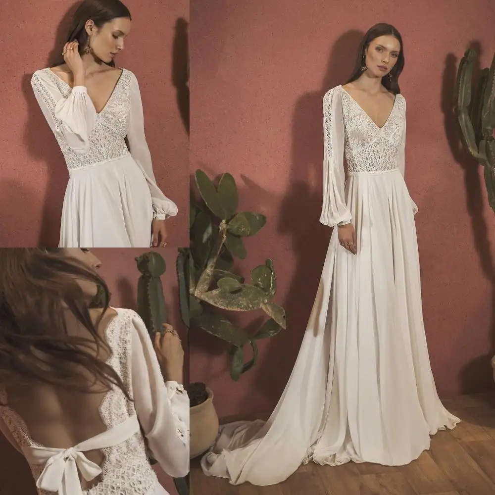 2020 богемское свадебное платье с v-образным вырезом и длинными рукавами, кружевные аппликации для свадебных платьев, сексуальное свадебное платье трапециевидной формы с открытой спиной