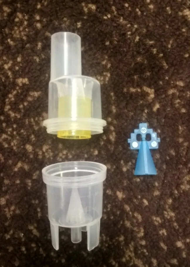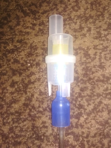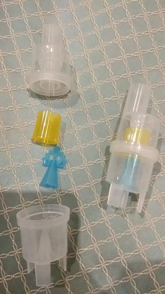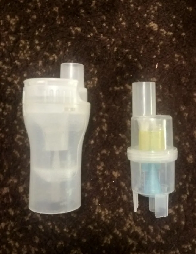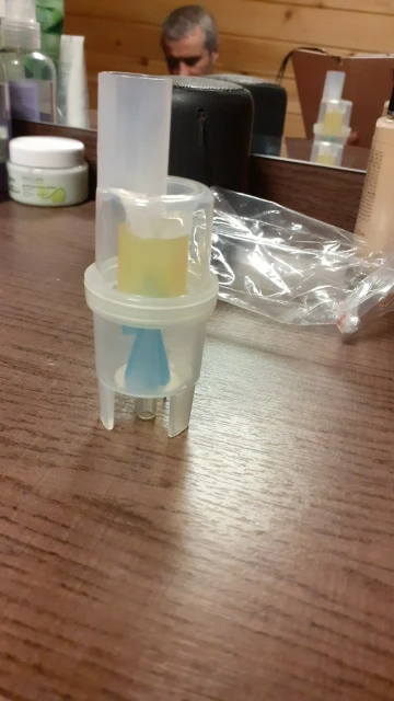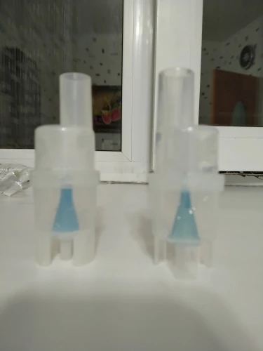 Подошло к небулайзеру OMRON NE C24. Отлично в работе, испробовали. Этот пластик можно кипятить. И если упадет, то стаканчик не хрупкий, а изготовлен из гибкого пластика, как и оригинальный стаканчик. Маска, загубник, трос, все это подходит по диаметру без проблем. В оригинальном стакане есть специальная выемка, чтобы можно было временно закрепить на самом небулайзере. Этот тоже можно, лично у меня получилось.