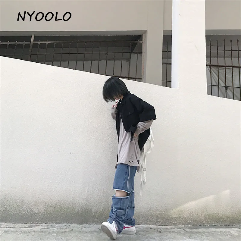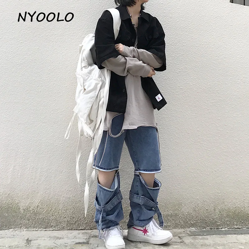 Джинсы NYOOLO женские, мужские, Осенние, широкие, в полную длину, с застежкой-молнией, в стиле хип-хоп, для скейтборда