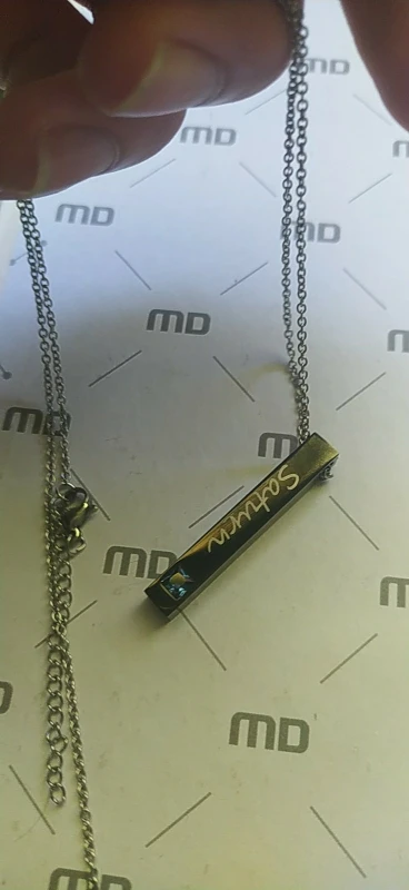 Это очень хорошо, это именно так, как это происходит в объявлении, и все идеально, без проблем. На мой вкус цепь немного короткая, но ее можно поменять, а буквы немного большие, в остальном идеальные.