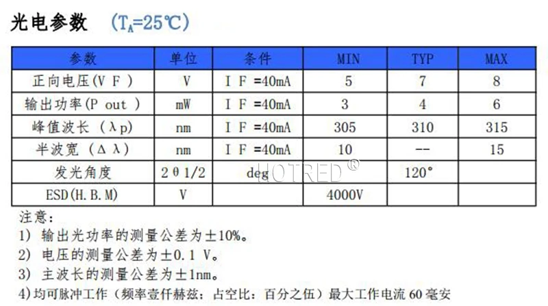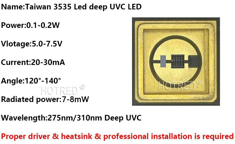 Характеристика продуктаA. Эффективность: эффект стерилизации может быть до 99.9% в короткое время.B. Энергосбережение: по сравнению с традиционными лампами Энергосбережение составляет до 80%C. Охрана окружающей среды: неметаллический газ или вредные вещества, излучающие технологии.E. Мгновенный запускF: Срок службы:> 10000 часовПримечания для UVC-LED 275nm -310nmA. Не прикасайтесь к светодиодный или не повлияет на обычный светильникB. Устройства питания должны подтвердить положительный и отрицательный, полярность заднего хода может повредить устройствоC. Строгая работа в соответствии с электрическими параметрами, слишком высокое напряжение может повредить устройствоD. UVC-LED состояние следует избегать близкого наблюдения невооруженным глазом ..