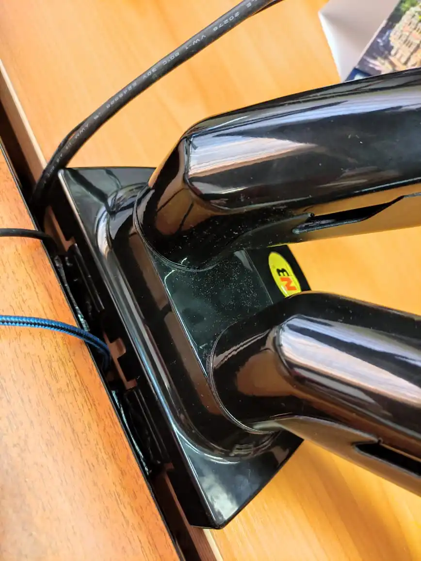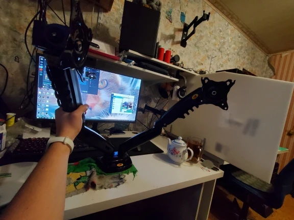 Отличная лапа под 2 монитора. Все запчасти из толстенного металла, выглядит мощной. Провода прячутся аккуратно, все пружины регулируются.