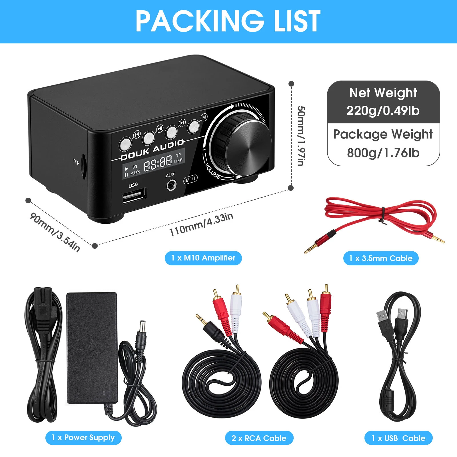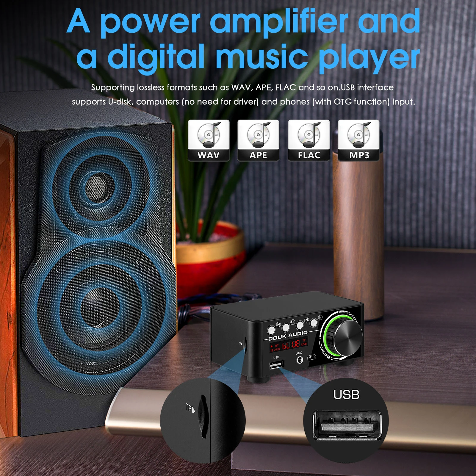 Как цифровой усилитель мощности и музыкальный плеер, он поддерживает входы для карт RCA/AUX/USB/BT 5,0/TF, почти совместим со всеми домашними аудиоустройствами, такими как телефон, планшет, компьютер, телевизор, набор-коробка, CD-плеер и т. Д. U-диск и tf-карта поддерживают форматы WAV, APE, FLAC без потерь.