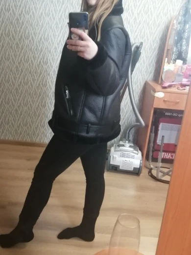Отличная куртка! Кожа мягкая, на кожу то и не очень похожа. Смесь замши и мягкого кожзама. Из минусов очень лезет мех, прямо кусками. Надеюсь это пройдёт. Надела её на белое поло. На работе зумучалась очищать свою белую футболку от чёрных ворсинок... Если мех лезть перестанет то будет вообще супер. Брала S на свой 42 размер. Смотрится оверсайз. Параметры примерно 84-65-93, рост 160 см. И при этом размер одежды у меня xs-s. Как на 42 девочки берут М я не понимаю, потому что и S смотрится достаточно обьемно. С продавцом не общалась. В Москву пришла быстро - за 13 дней. Покупала по акции за 2902 руб.