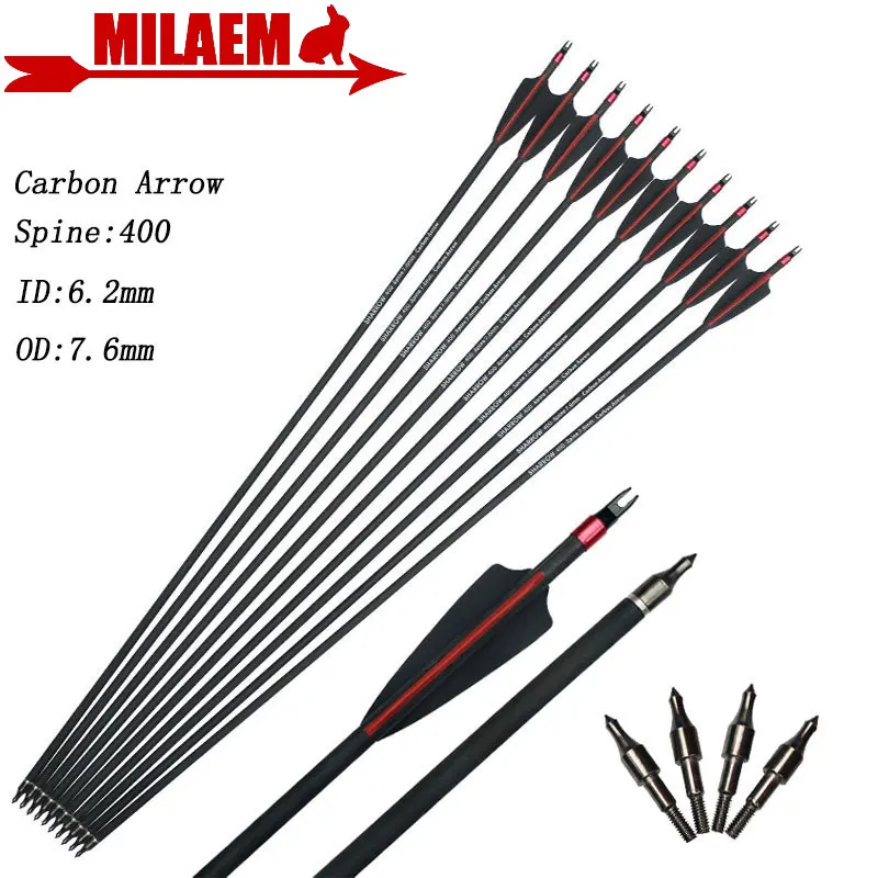 Стрелы из углеродного волокна для стрельбы из лука, аксессуары для стрельбы, 612 шт., 30 дюймов, 400 id6.2 мм od7.6 мм, 3 дюйма, стрелы для охотничьего лука