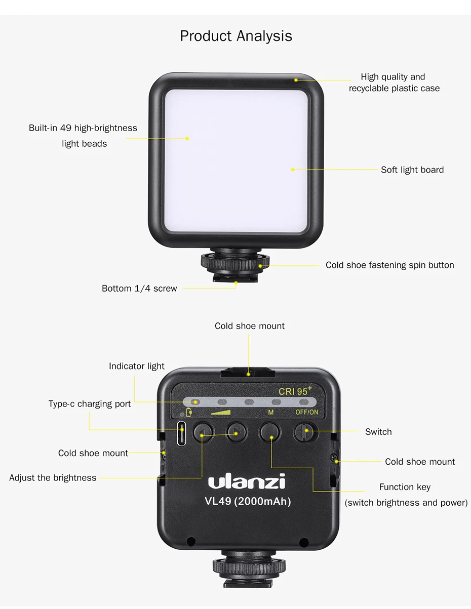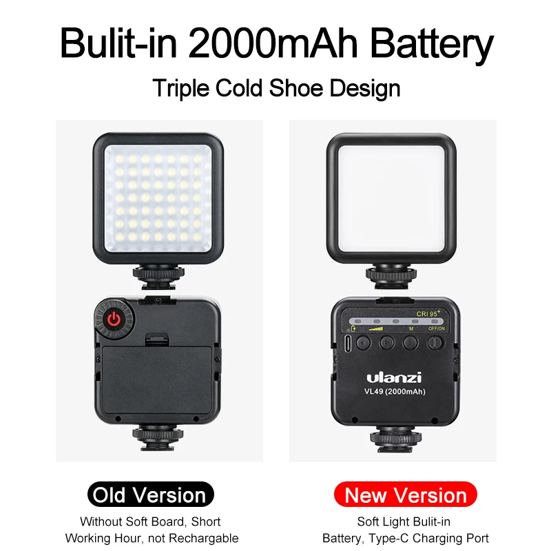 Светодиодный мини-светильник Ulanzi VL49, приглушаемый CRI95 + 6 Вт с холодным башмаком для цифровой зеркальной камеры Canon, Nikon, Sony, лампа заполняющая свет для видеоблога