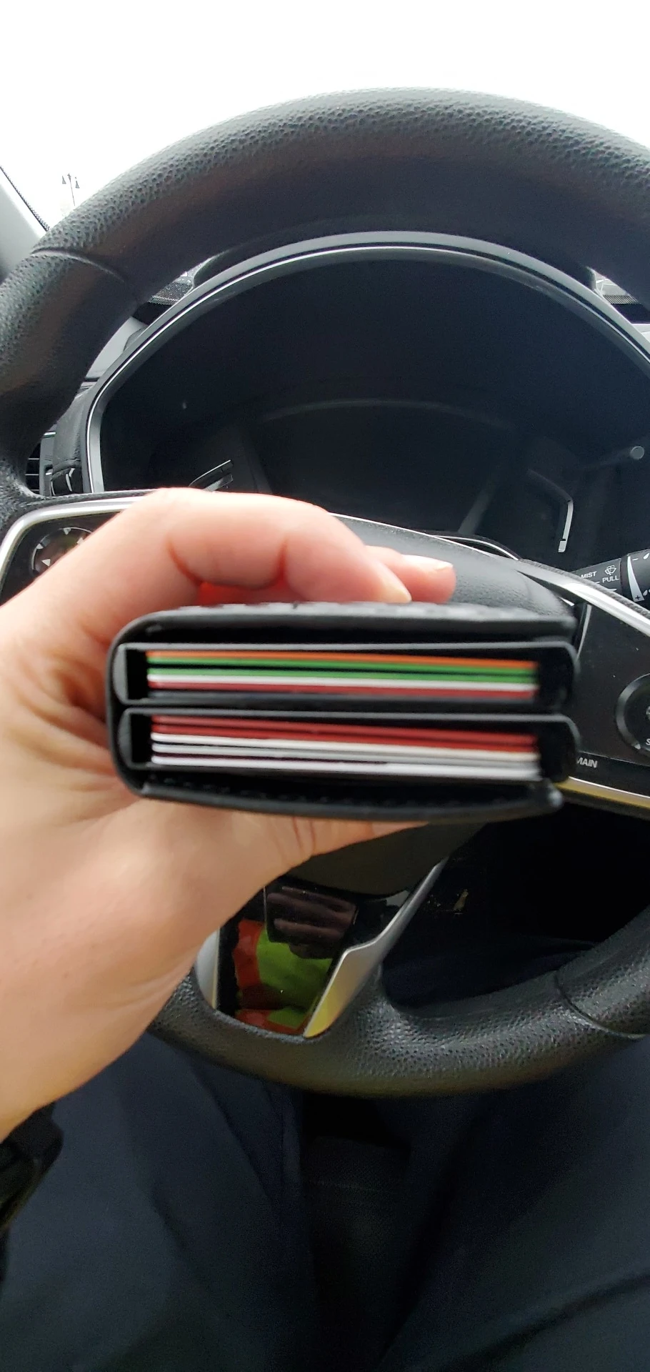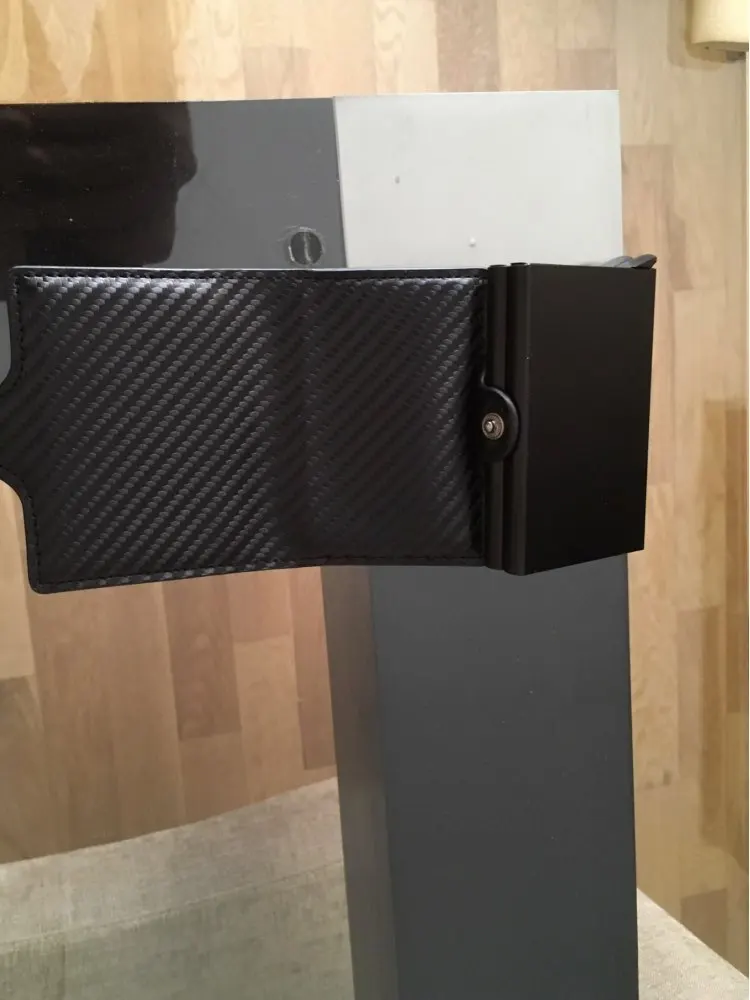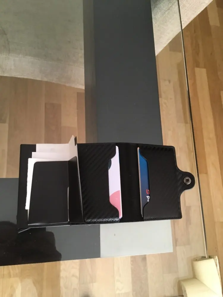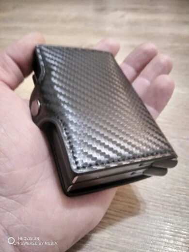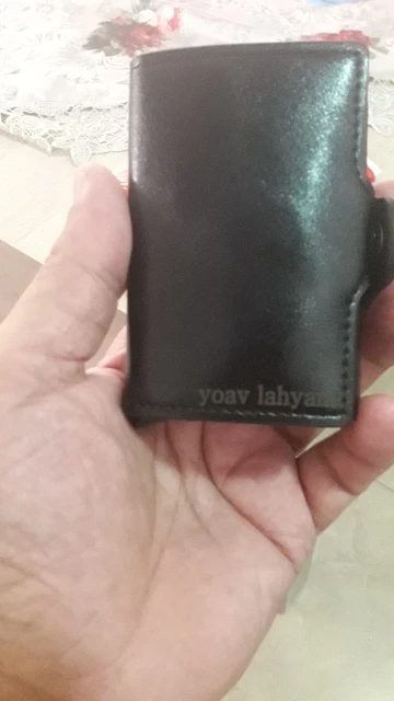 Супер бумажник, если вы много карт для хранения. Две металлические коробки вынимают карты, если вы вытягиваете небольшой рычаг. Моя монограмма была красиво размещена, это просто не так горит. Я рекомендую этот продукт любой из многих карт.