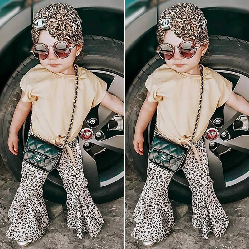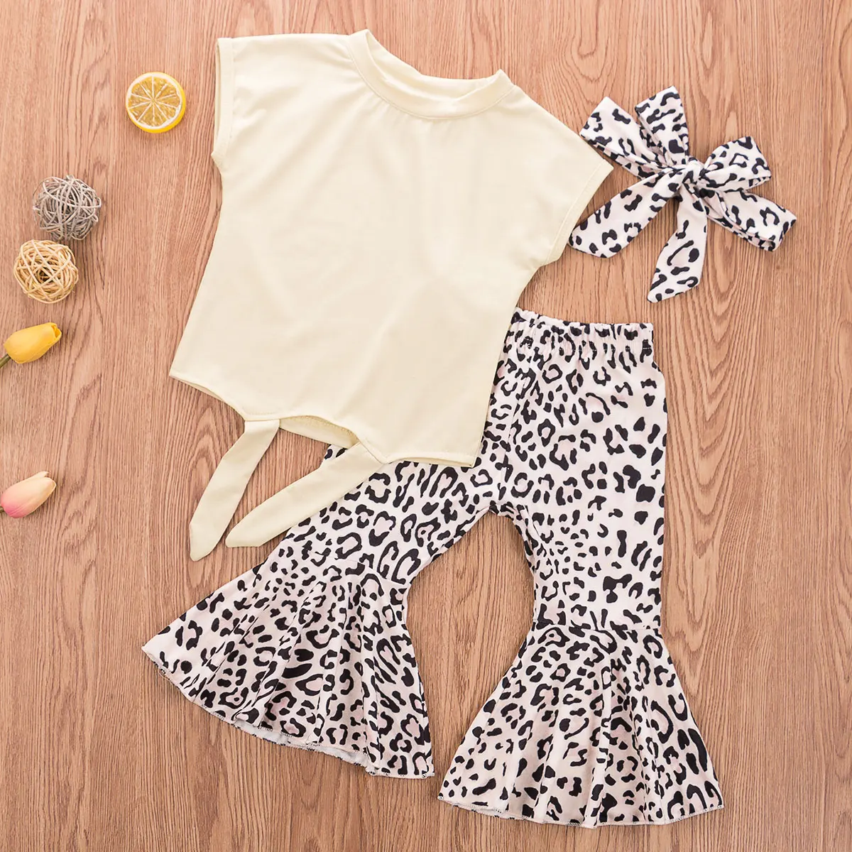 Focusnorm От 0 до 5 лет одежда для малышей, одежда для девочек, Короткие хлопковые однотонные Топы + длинные брюки с леопардовым принтом + повязка на голову, комплект повседневной одежды