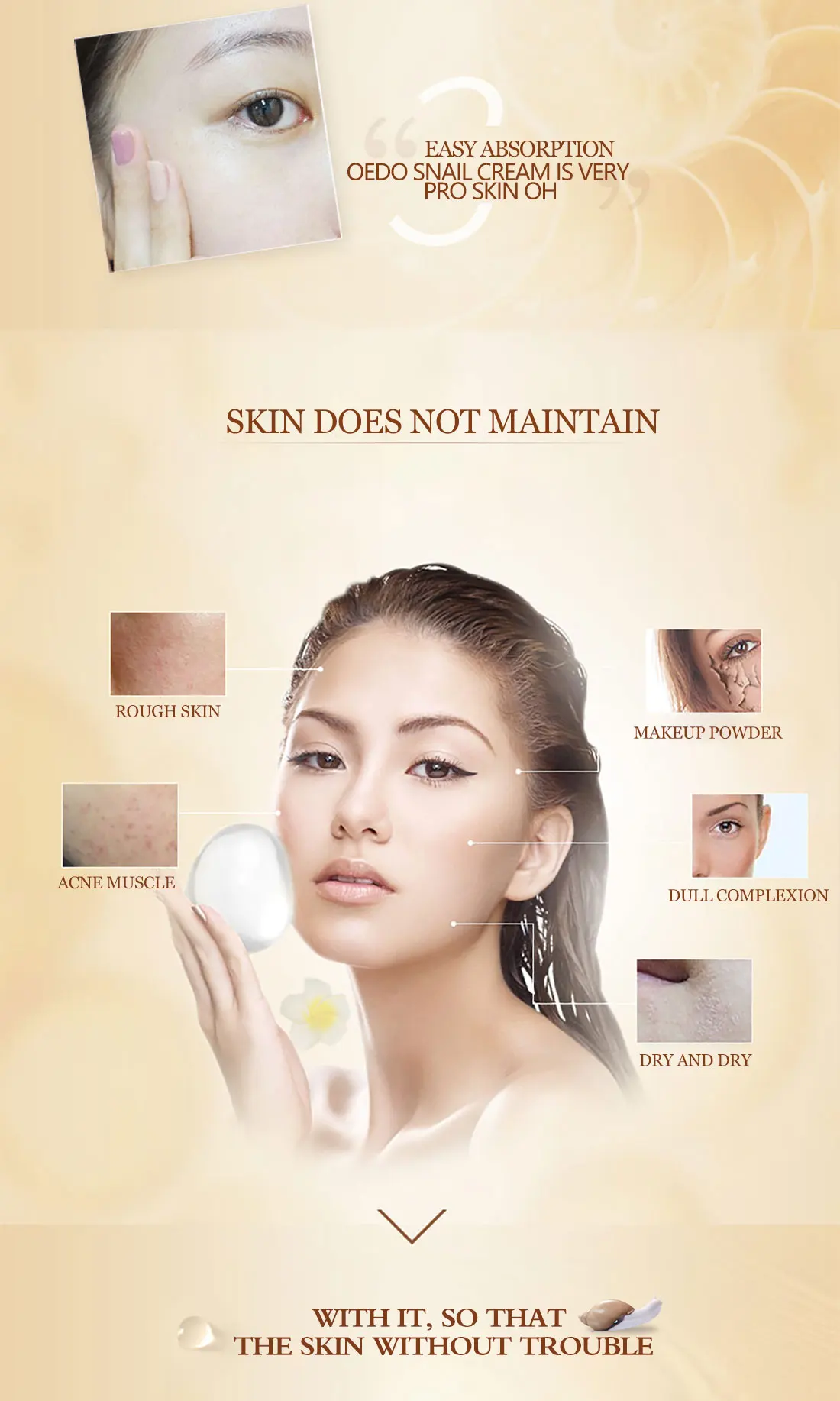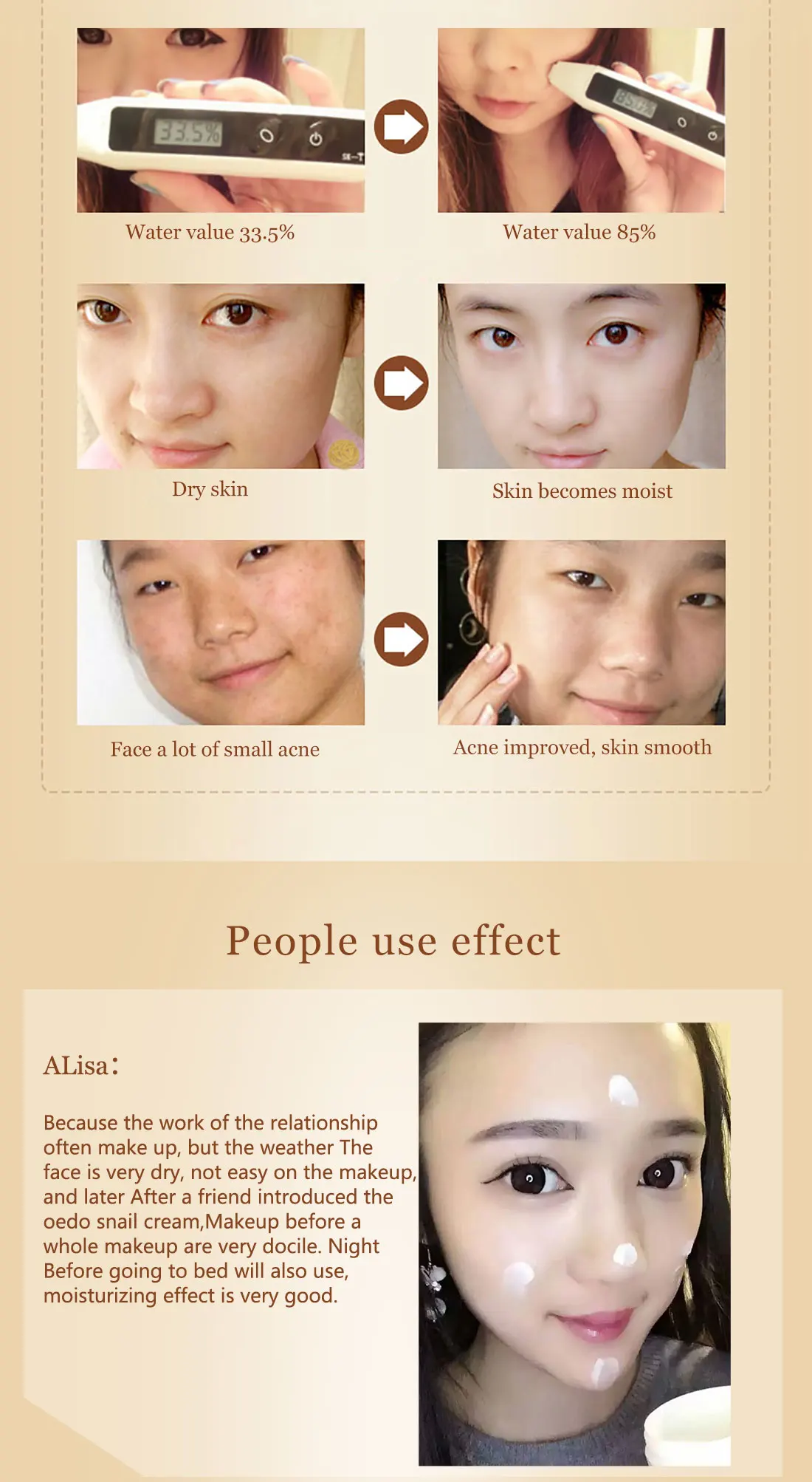 Содержит эссенцию экстракта улитки, ее текстура мягкая и влажная с нежным и мягким ощущением на ощупь и легко впитывается кожей. Это может помочь улучшить тусклую кожу, которая восполняет влагу и питание для защиты сухой и грубой кожи. Борясь с морщинами и укрепляя нежную кожу, она также сохранит уровень влаги кожи, оставляя ее влажной и гладкой с молодой блестящей.