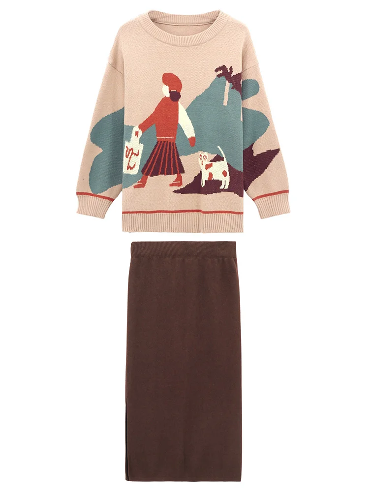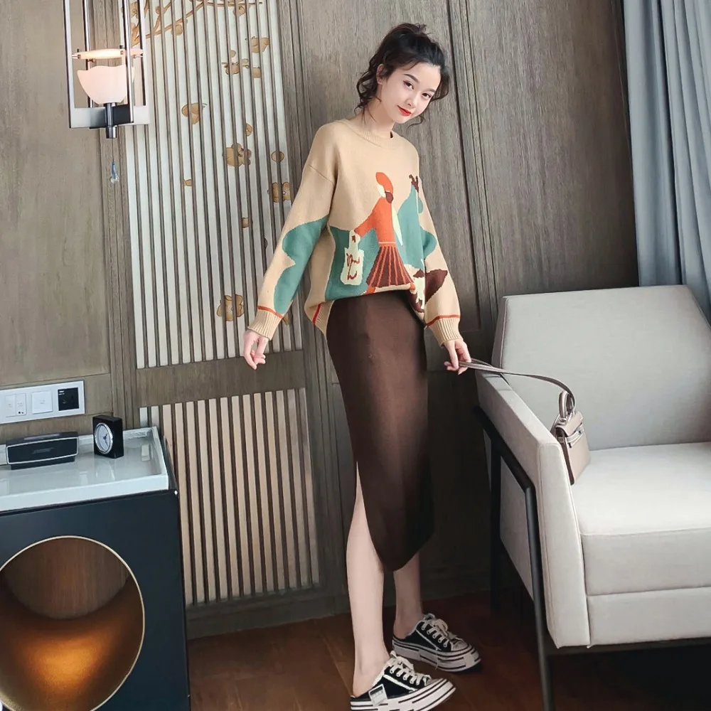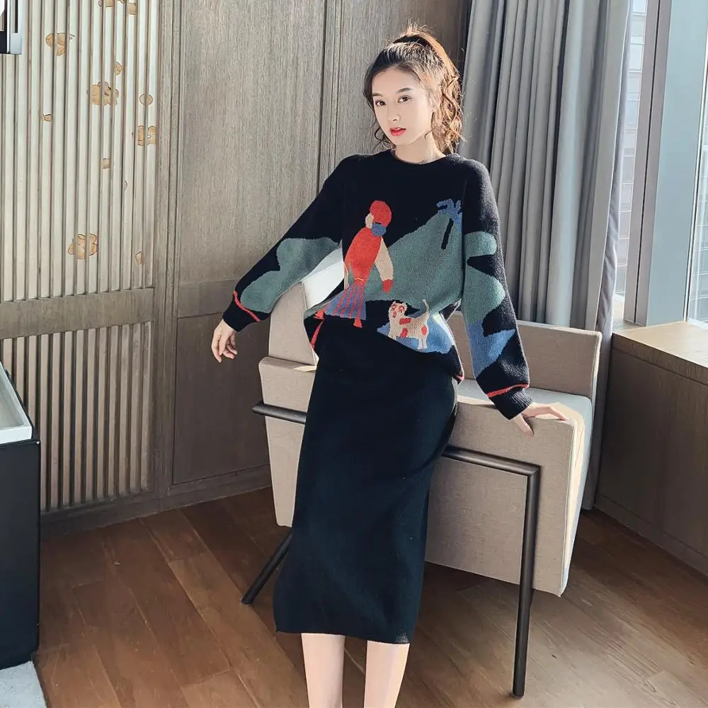 Комплект из 2 предметов SMTHMA, женский зимний вязаный свитер в Корейском стиле с героями мультфильмов для девочек + юбка с высокой талией, костюм, женские комплекты со свитером, новинка 2022