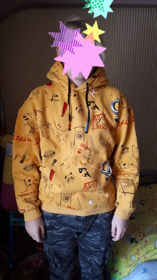 Шикарная толстовка! Даже не сомневалась, что качество будет на высоте, так как это не первый мой заказ в этом магазине. Тёплая, уютная вещь. Действительно с хорошим утеплителем, плотная, удобная, красивая. В жёлтом цвете толстовка очень красивая, хотя уверена и другие цвета по своему хороши) Размер 2XL (европейский L) на рост/вес- 180/80 подошёл отлично. Т.к модель оверсайз, то можно было на размер больше взять. Сыну так нравится, а мне хотелось, чтобы толстовка объёмней смотрелась. Тут дело вкуса. Размереая таблица продавца верна, можно смело выбирать по ней. Материал (состав) мне непонятен, но очень приятный, особенно внутренняя часть. Толстовка мягкая и плотная. Принт интересный, выполнен качественно. К пошиву никаких нареканий, всё аккуратно.