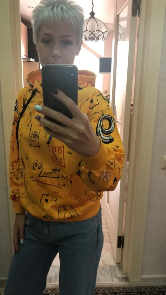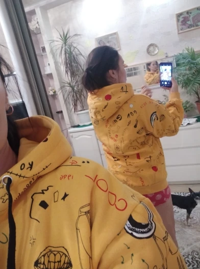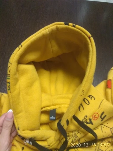 Цвет не такой как на фото, скорее горчичный, а не жёлтый. На девушку размера S взяли XXL, ей понравилось. Качество неплохое, если бы брали по размеру - капюшон был бы мал. С учётом того, что сама толстовка сильно велика, капюшон в самый раз